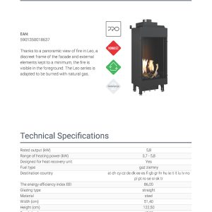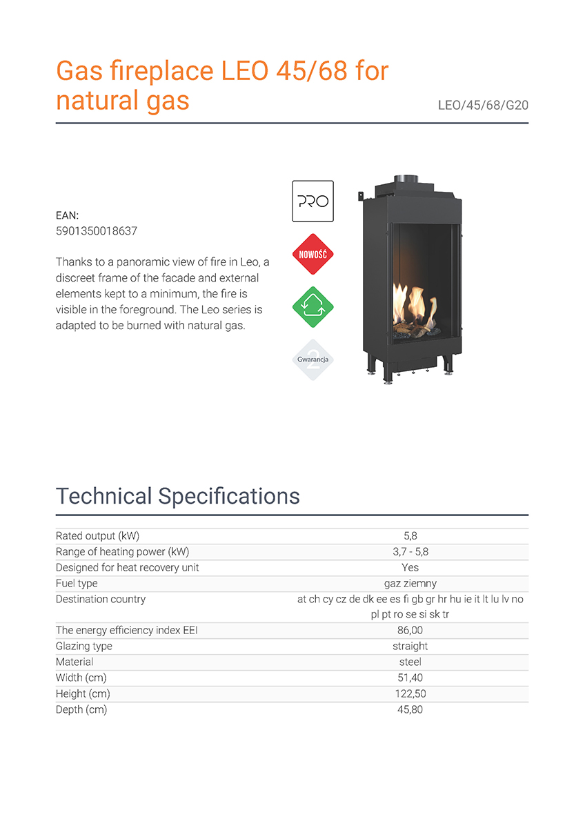 Το Kratki Leo 45 68 G20 αποτελεί ενεργειακό τζάκι φυσικού αερίου, ίσιας όψης και είναι κατασκευασμένο από χάλυβα. Διαθέτει ονομαστική ισχύ 5,8 kW, ενεργειακή κλάση (B) και συνοδεύεται από μονάδα ελέγχου της φλόγας με τηλεχειρισμό, καθώς και από διακοσμητικά κεραμικά ξύλα για την επένδυση του εσωτερικού του θαλάμου καύσης.