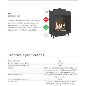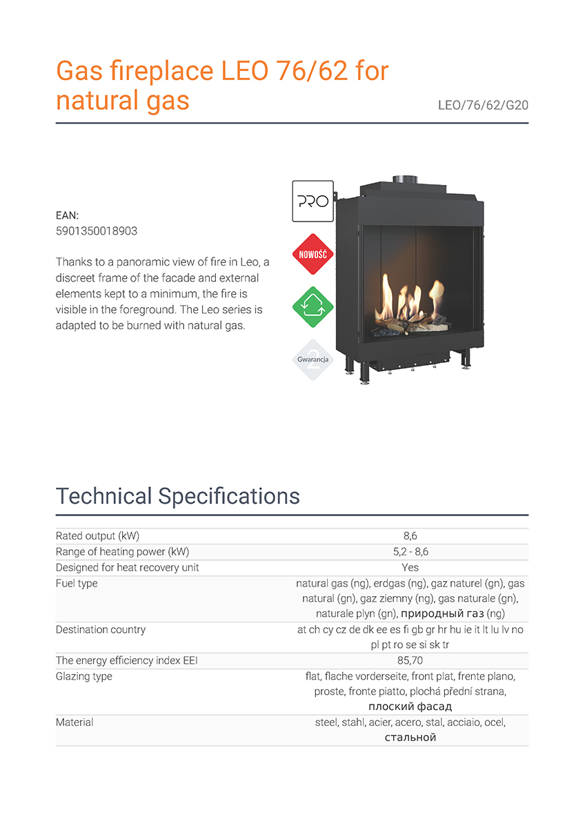 Το Kratki Leo 76 62 G20 αποτελεί ενεργειακό τζάκι φυσικού αερίου, κατασκευασμένο από χάλυβα. Διαθέτει ίσια όψη, ονομαστική ισχύ 8,6 kW και αποτελεί κατάλληλη λύση για εσωτερικούς χώρους από 55 έως 90 m². Πρόκειται για εστία ενεργειακής κλάσης (Β) και συνοδεύεται από μονάδα ελέγχου της φλόγας με τηλεχειρισμό, καθώς και από διακοσμητικά κεραμικά ξύλα για την επένδυση του εσωτερικού του θαλάμου καύσης. Χάρη στην πανοραμική θέα της φωτιάς, το διακριτικό πλαίσιο της πρόσοψης και το γεγονός ότι τα εξωτερικά του στοιχεία περιορίζονται στο ελάχιστο, η φλόγα γίνεται περισσότερο ορατή στο προσκήνιο.