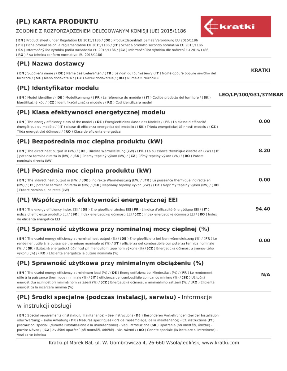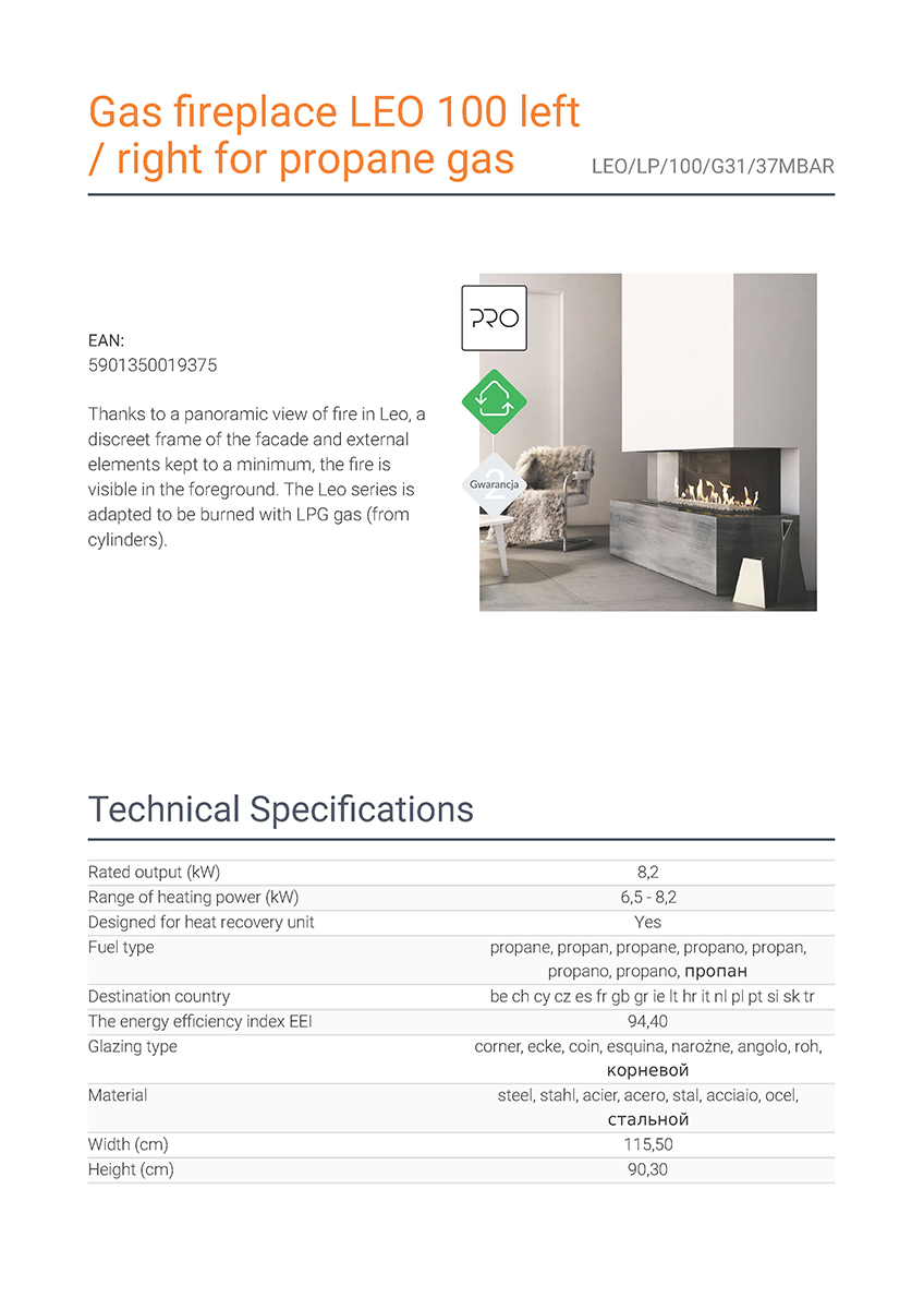 Το Kratki Leo LP 100 G31 αποτελεί ενεργειακό τζάκι υγραερίου τριών όψεων, κατασκευασμένο από χάλυβα. Διαθέτει ονομαστική ισχύ 8,2 kW, ενεργειακή κλάση Α και συνοδεύεται από μονάδα ελέγχου της φλόγας με τηλεχειρισμό και διακοσμητικά κεραμικά ξύλα για την επένδυση του εσωτερικού του θαλάμου καύσης.