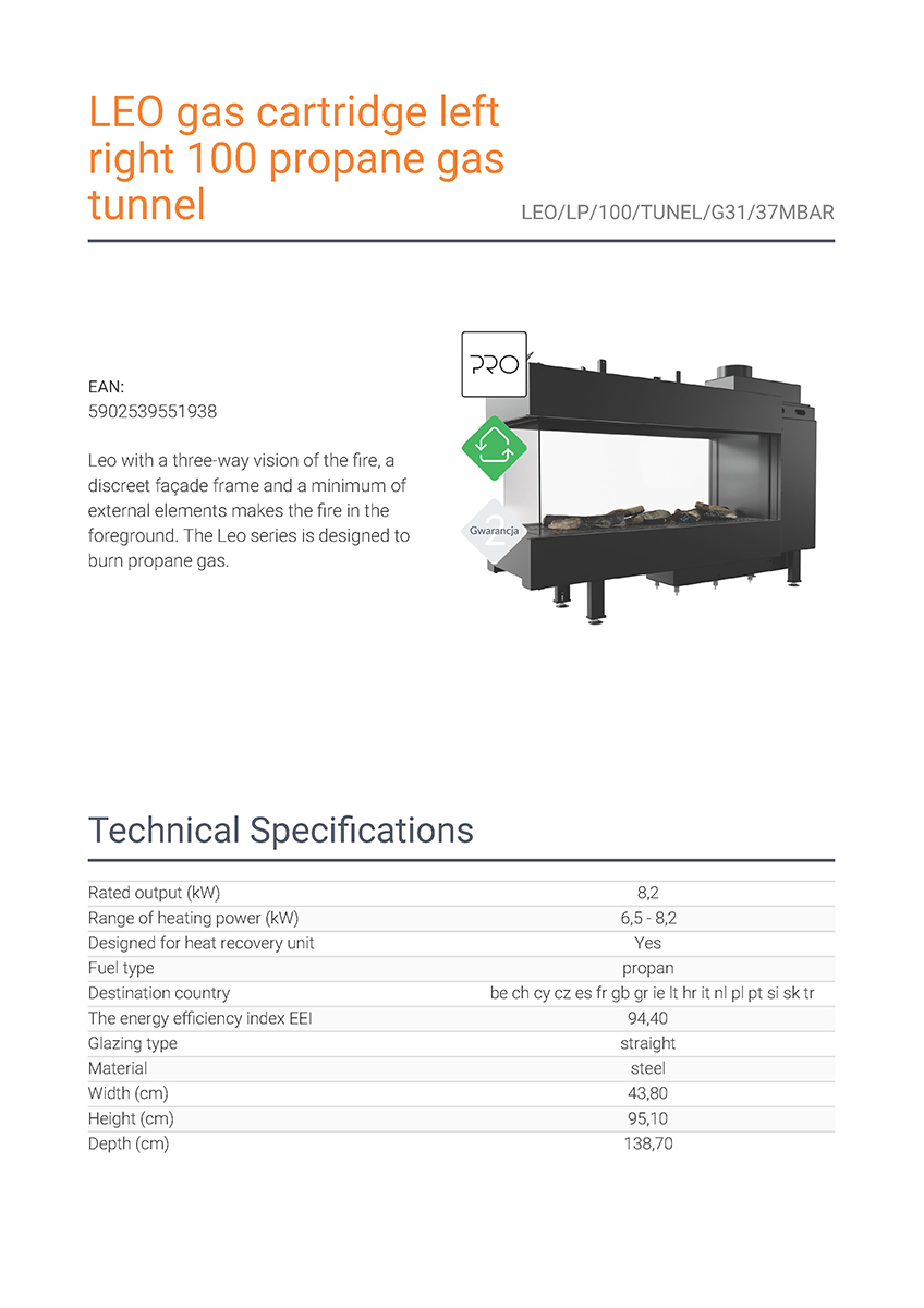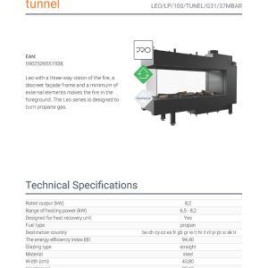 Το Kratki Leo LP 100 Tunel G31 αποτελεί διαμπερές ενεργειακό τζάκι υγραερίου τριών όψεων, κατασκευασμένο από χάλυβα. Διαθέτει ονομαστική ισχύ 8,2 kW, ενεργειακή κλάση (Α) και συνοδεύεται από μονάδα ελέγχου της φλόγας με τηλεχειρισμό, καθώς και από διακοσμητικά κεραμικά ξύλα για την επένδυση του εσωτερικού του θαλάμου καύσης.