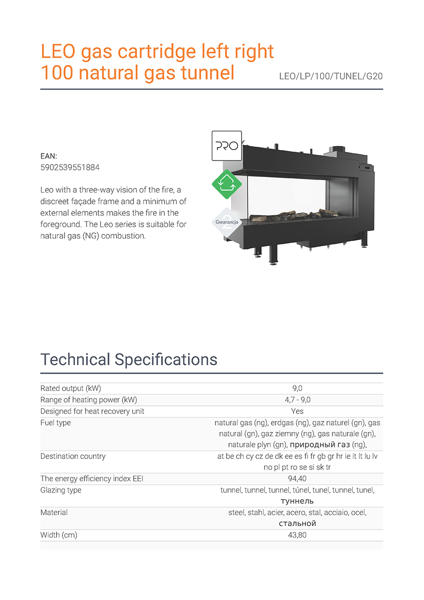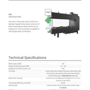 Το Kratki Leo LP 100 Tunnel G20 αποτελεί διαμπερές ενεργειακό τζάκι φυσικού αερίου τριών όψεων και είναι κατασκευασμένο από χάλυβα. Διαθέτει ονομαστική ισχύ 9 kW, ενεργειακή κλάση (Α) και συνοδεύεται από μονάδα ελέγχου της φλόγας με τηλεχειρισμό, καθώς και από διακοσμητικά κεραμικά ξύλα για την επένδυση του εσωτερικού του θαλάμου καύσης.