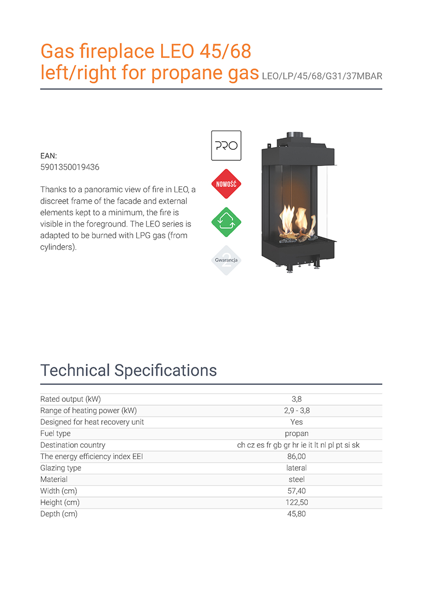 Το Kratki Leo LP 45 68 G31 αποτελεί ενεργειακό τζάκι υγραερίου (γκαζιού), τριών όψεων και είναι κατασκευασμένο από χάλυβα. Διαθέτει ονομαστική ισχύ 3,8 kW, ενεργειακή κλάση (B) και συνοδεύεται από μονάδα ελέγχου της φλόγας με τηλεχειρισμό, καθώς και από διακοσμητικά κεραμικά ξύλα για την επένδυση του εσωτερικού του θαλάμου καύσης.