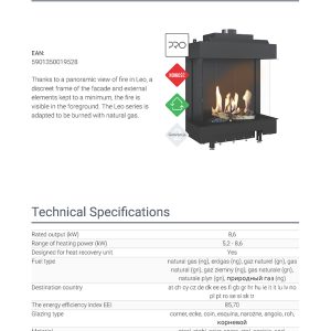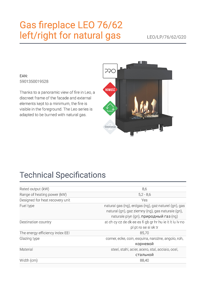 Το Kratki Leo LP 76 62 G20 αποτελεί ενεργειακό τζάκι φυσικού αερίου, κατασκευασμένο από χάλυβα. Διαθέτει τριπλή όψη και ονομαστική ισχύ 8,6 kW. Πρόκειται για εστία ενεργειακής κλάσης (Β), κατάλληλη για εσωτερικούς χώρους από 55 έως 90 m². Περιλαμβάνει μονάδα ελέγχου της φλόγας με τηλεχειρισμό και κεραμικά ξύλα για τη διακόσμηση του θαλάμου καύσης. Χάρη στην πανοραμική θέα της φωτιάς, το διακριτικό πλαίσιο της πρόσοψης και το γεγονός ότι τα εξωτερικά του στοιχεία περιορίζονται στο ελάχιστο, η φλόγα γίνεται περισσότερο ορατή στο προσκήνιο.