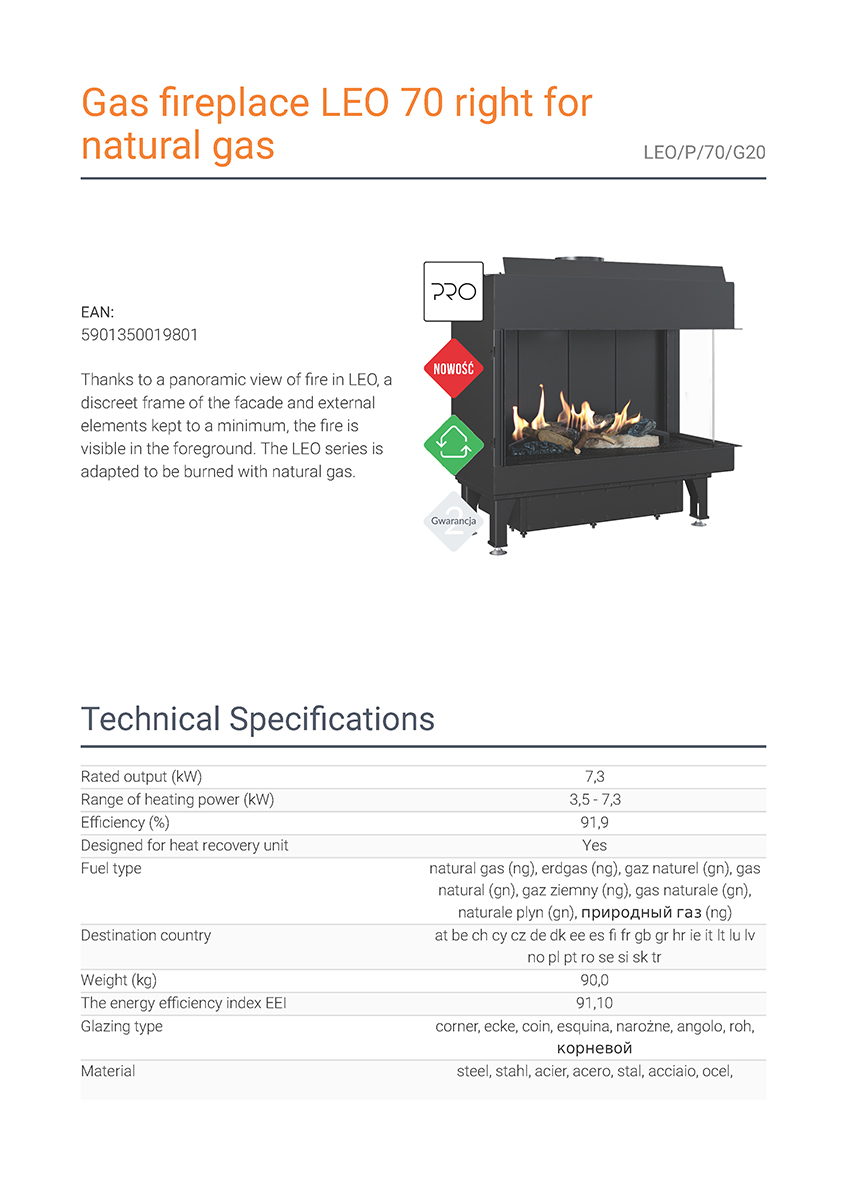 Το Kratki Leo P 70 G20 αποτελεί ενεργειακό τζάκι φυσικού αερίου δύο όψεων με δεξιά γωνία (ΔΓ) και είναι κατασκευασμένο από χάλυβα. Χάρη στην πανοραμική θέα της φωτιάς, το διακριτικό πλαίσιο της πρόσοψης και το γεγονός ότι τα εξωτερικά του στοιχεία περιορίζονται στο ελάχιστο, η φλόγα είναι ορατή στο προσκήνιο. Διαθέτει ονομαστική ισχύ 7,3 kW και θερμική απόδοση 91,9%. Αποτελεί οικονομική και αποδοτική λύση θέρμανσης για εσωτερικούς χώρους έως 75 m², όντας εστία ενεργειακής κλάσης Α.