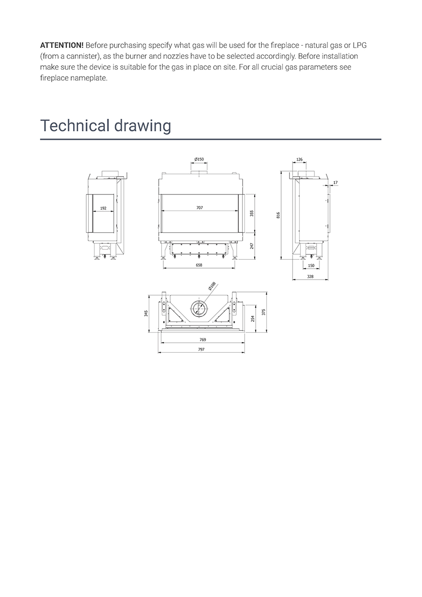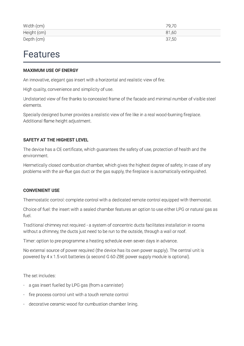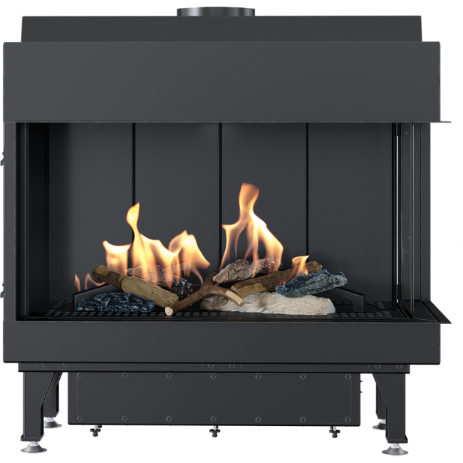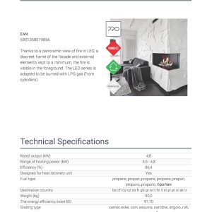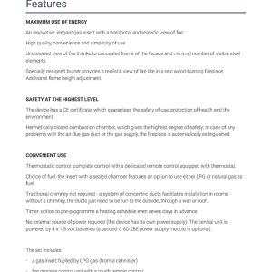 Η εστία, επίσης, συνοδεύεται από μονάδα ελέγχου της φλόγας με τηλεχειρισμό και διακοσμητικά κεραμικά βότσαλα για την επένδυση του εσωτερικού του θαλάμου καύσης.