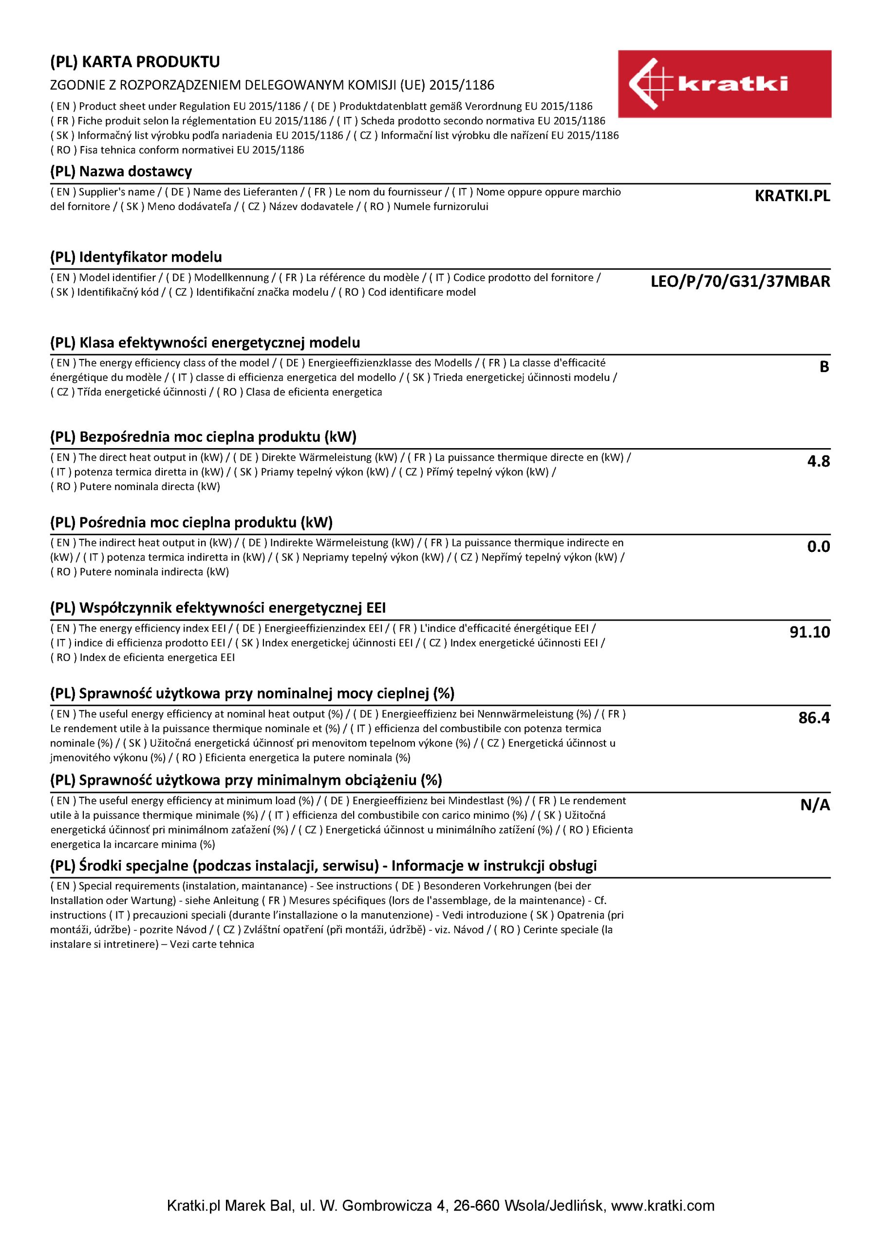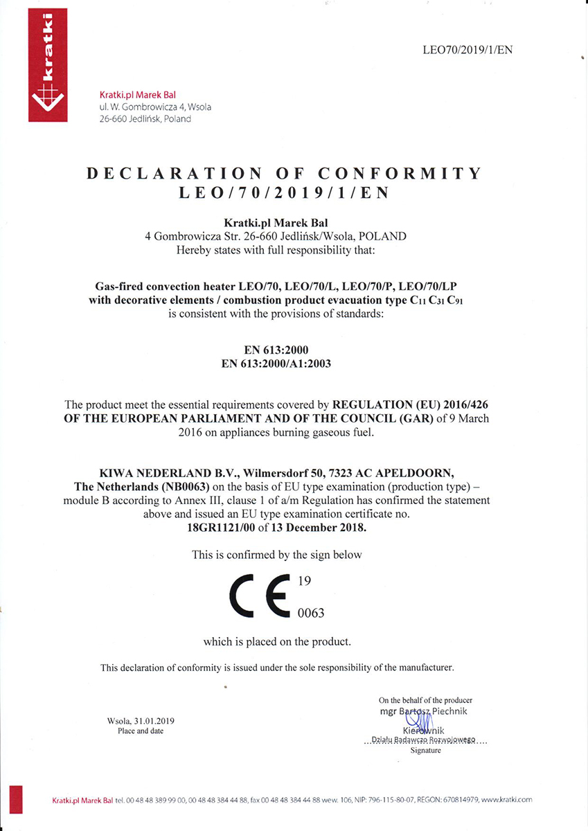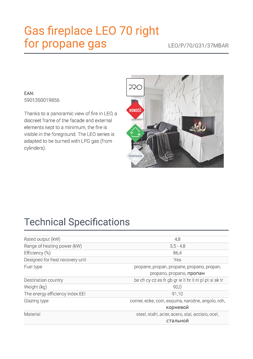 Το Kratki Leo P 70 G31 αποτελεί ενεργειακό τζάκι υγραερίου, που είναι κατασκευασμένο από χάλυβα και έχει διπλή όψη δεξιάς γωνίας. Χάρη στην πανοραμική θέα της φωτιάς, το διακριτικό πλαίσιο της πρόσοψης και το γεγονός ότι τα εξωτερικά του στοιχεία περιορίζονται στο ελάχιστο, η φλόγα είναι ορατή στο προσκήνιο. Διαθέτει ισχύ 4,8 kW και απόδοση θερμική 86,4%. Αποτελεί κατάλληλη λύση για εσωτερικούς χώρους 50 m² περίπου, όντας εστία ενεργειακής κλάσης Β.