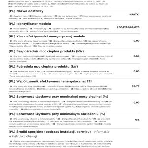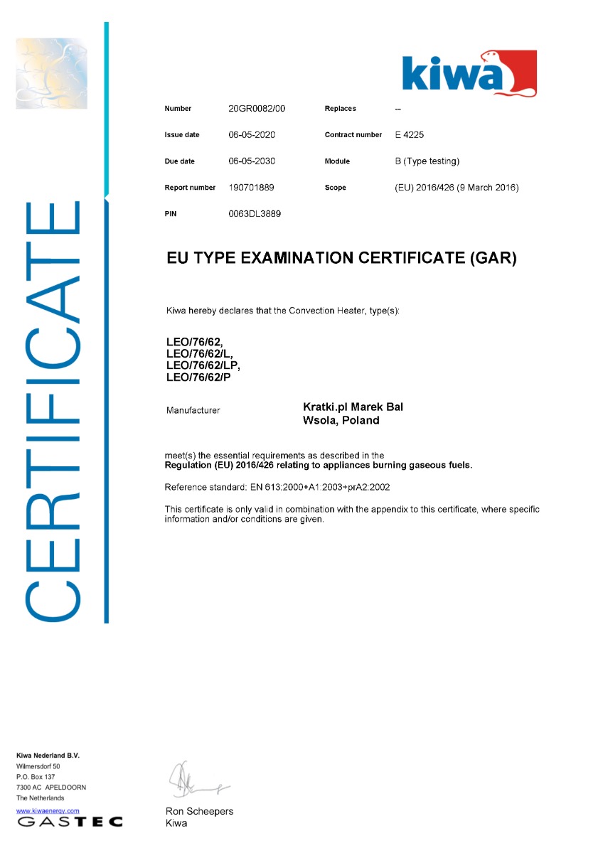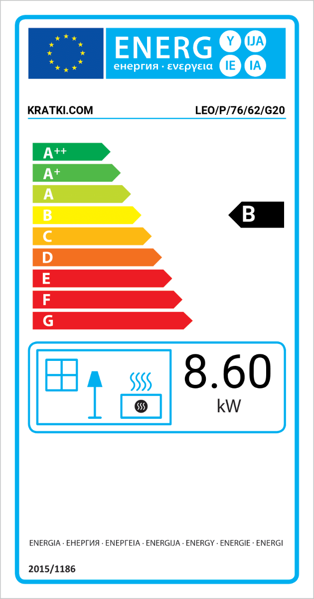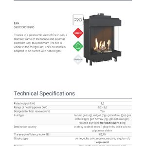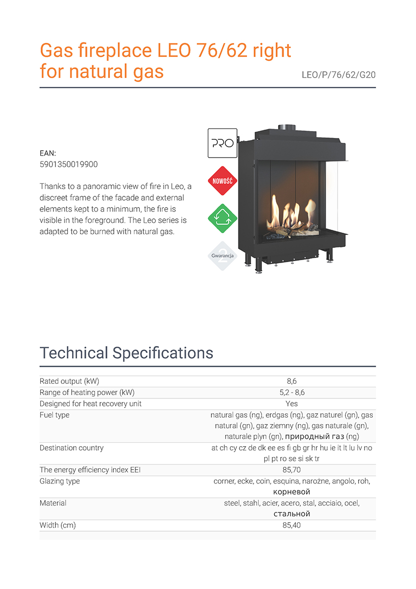Το Kratki Leo P 76 62 G20 αποτελεί ενεργειακό τζάκι φυσικού αερίου, κατασκευασμένο από χάλυβα. Διαθέτει διπλή όψη με δεξιά γωνία και ονομαστική ισχύ 8,6 kW. Πρόκειται για εστία ενεργειακής κλάσης (Β), κατάλληλη για εσωτερικούς χώρους από 55 έως 90 m². Περιλαμβάνει μονάδα ελέγχου της φλόγας με τηλεχειρισμό και κεραμικά ξύλα για τη διακόσμηση του θαλάμου καύσης. Χάρη στην πανοραμική θέα της φωτιάς, το διακριτικό πλαίσιο της πρόσοψης και το γεγονός ότι τα εξωτερικά του στοιχεία περιορίζονται στο ελάχιστο, η φλόγα γίνεται περισσότερο ορατή στο προσκήνιο.