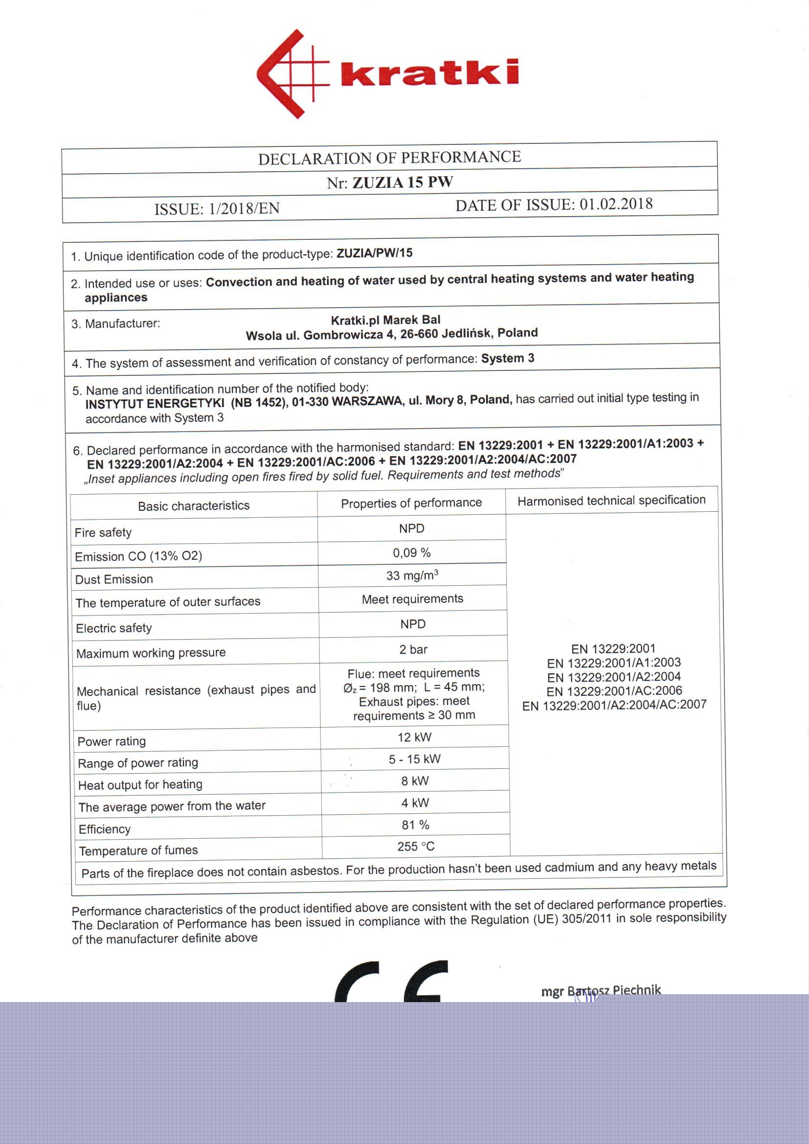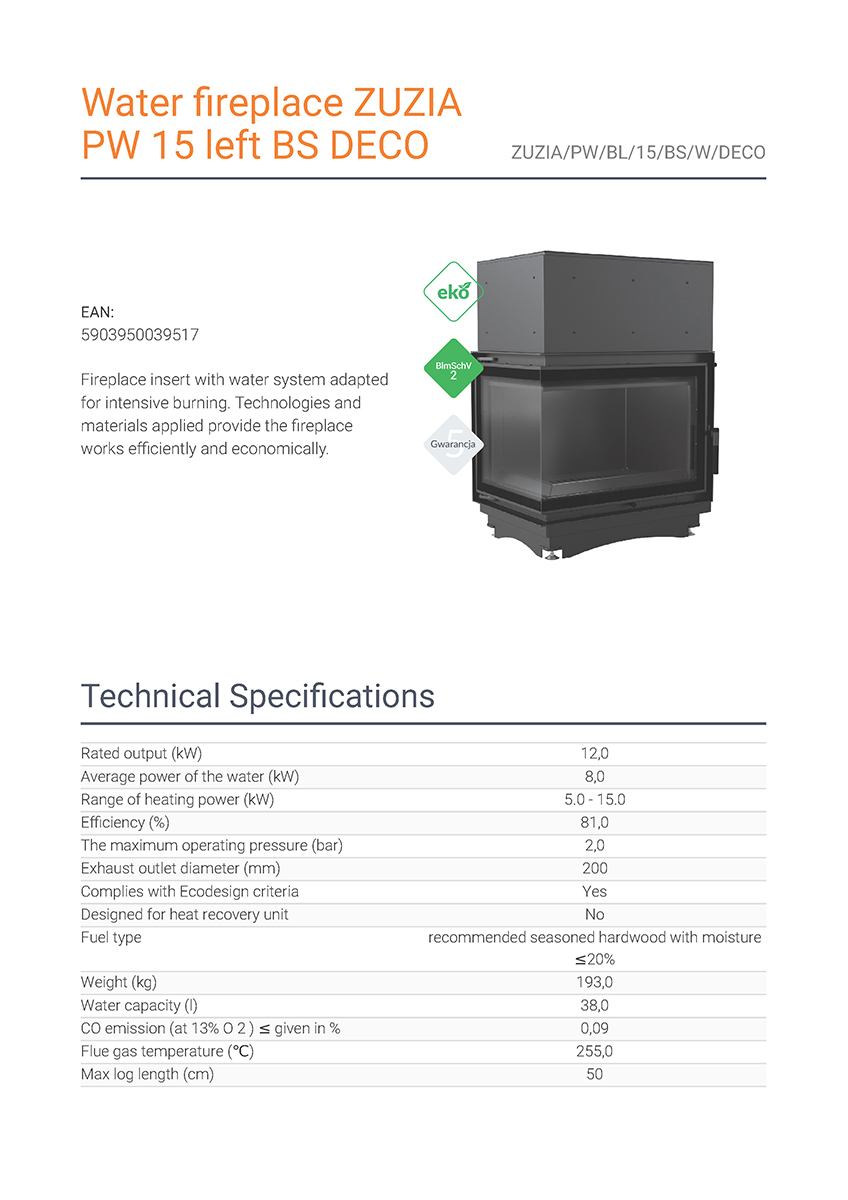 Το Kratki Zuzia PW BL 15 BS W Deco αποτελεί ενεργειακό τζάκι καλοριφέρ κλειστού δοχείου διαστολής, κατασκευασμένο από χάλυβα με βάση μαντέμι. Διαθέτει ρυθμιζόμενη ωφέλιμη ισχύ 5-15 kW με θερμική απόδοση 81%, διπλή όψη αριστερής γωνίας και ανοιγόμενη πόρτα με διακοσμημένο κεραμικό τζάμι. Πρόκειται για υδραυλικό τζάκι ενεργειακής κλάσης Α και αποτελεί κατάλληλη λύση για εσωτερικούς χώρους έως 120-150 m². Πληροί τις προϋποθέσεις των προτύπων Ecodesign 2022 και τους περιορισμούς του προτύπου BlmSchV 2, το οποίο καθορίζει τη μέγιστη εκπομπή CO.