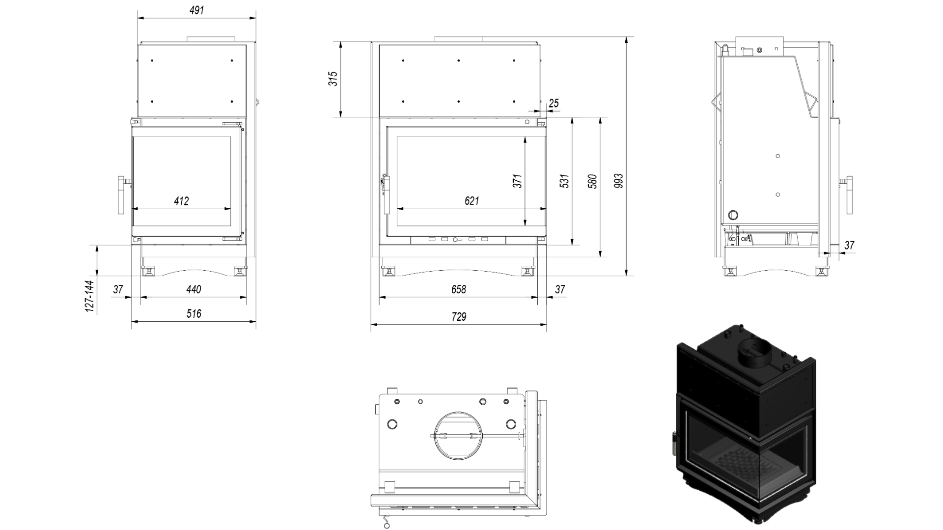 Χαλύβδινο Ενεργειακό Τζάκι Λέβητας Ξύλου Kratki Zuzia PW BP 15 BS W 5-15 kW Δεξί Γωνιακό Ανοιγόμενο με Βάση από Χυτοσίδηρο