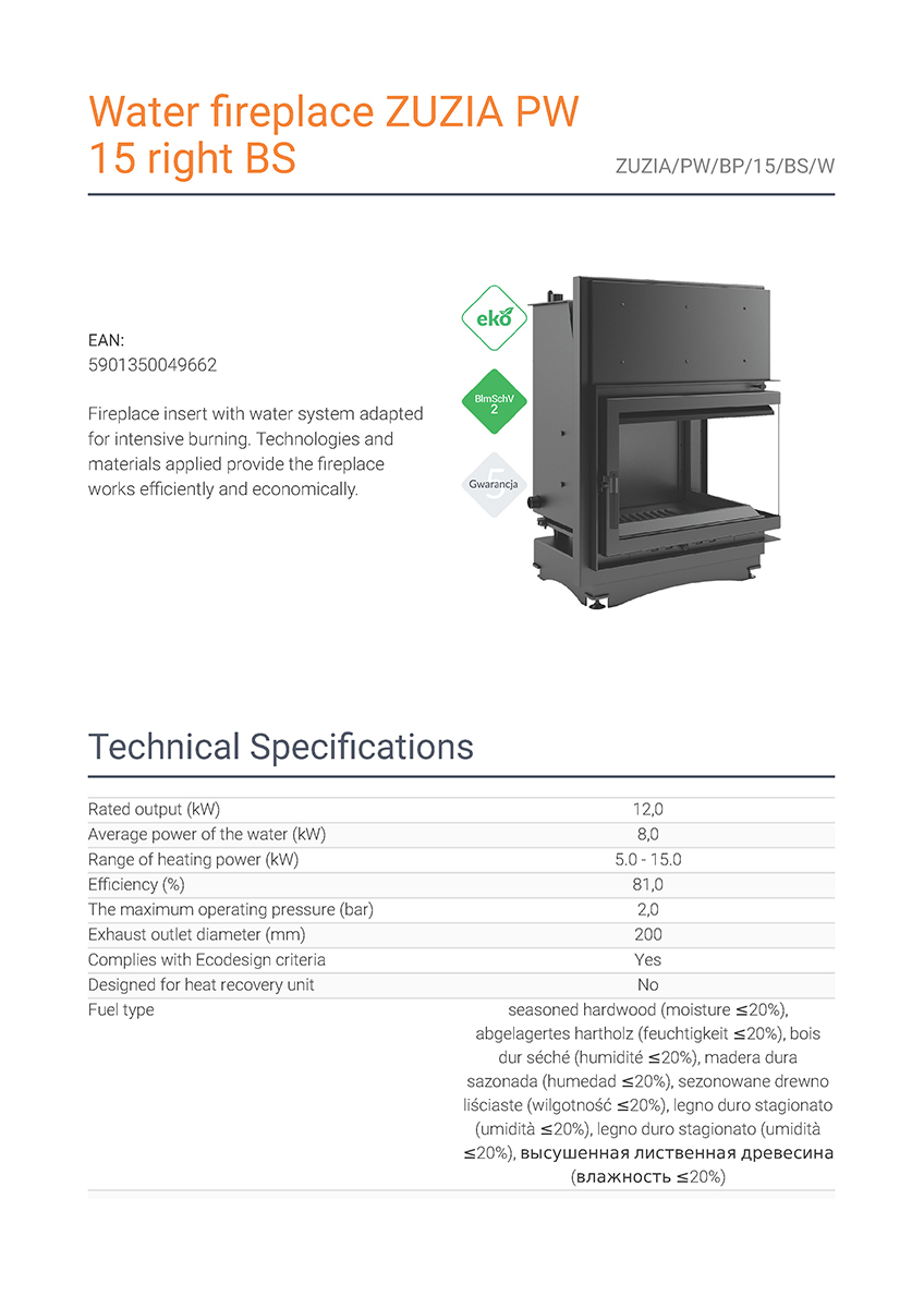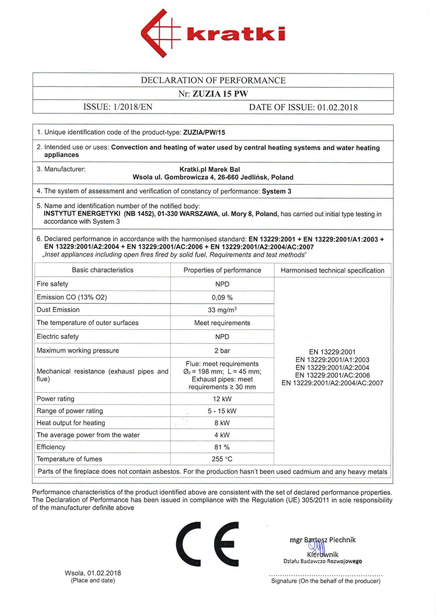 Το Kratki Zuzia PW BP 15 BS W αποτελεί ενεργειακό τζάκι λέβητα κλειστού δοχείου διαστολής, κατασκευασμένο από χάλυβα με βάση από χυτοσίδηρο. Διαθέτει ρυθμιζόμενη ωφέλιμη ισχύ 5-15 kW με θερμική απόδοση 81%, δύο όψεις με δεξιά γωνία και ανοιγόμενη πόρτα. Πρόκειται για υδραυλικό τζάκι ενεργειακής κλάσης Α και αποτελεί κατάλληλη λύση για εσωτερικούς χώρους έως 120-150 m², πληρώντας τις απαιτήσεις των προτύπων οικολογικού σχεδιασμού Ecodesign 2022 και τους περιορισμούς του προτύπου BlmSchV 2, το οποίο καθορίζει τη μέγιστη εκπομπή μονοξειδίου του άνθρακα (CO).