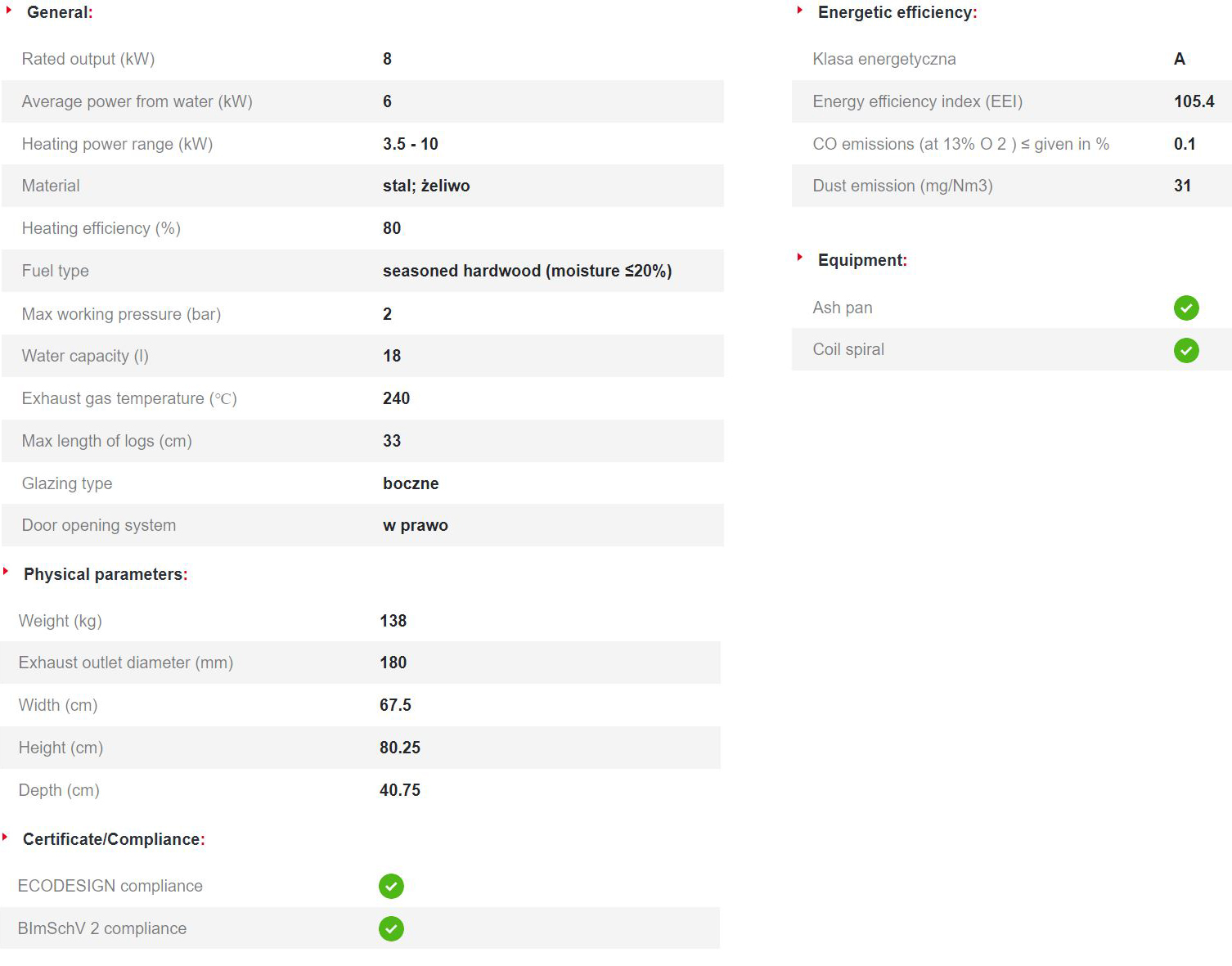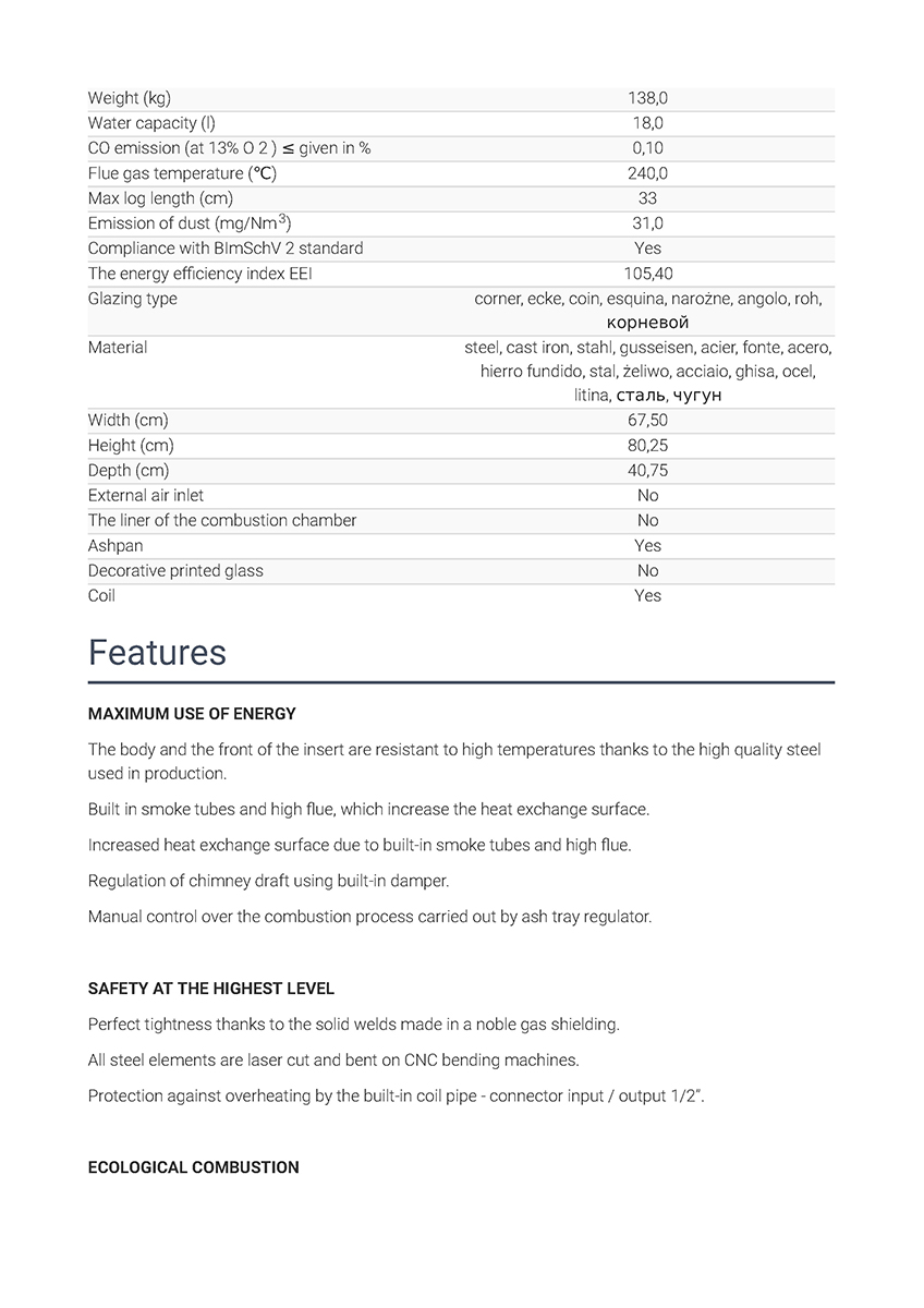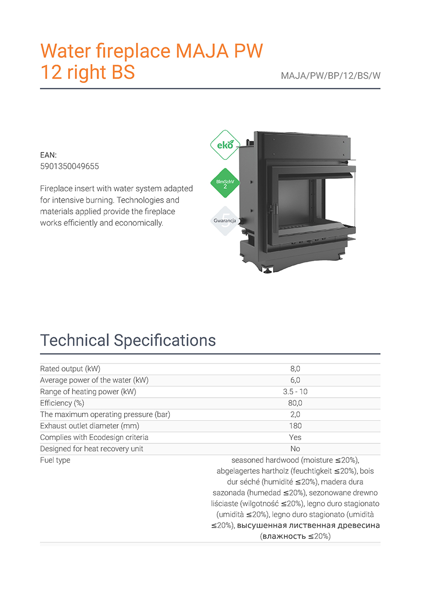 Το Kratki Maja PW BP 12 BS W αποτελεί ενεργειακό τζάκι νερού κλειστού δοχείου διαστολής, δύο όψεων με δεξιά γωνία και είναι κατασκευασμένο από χάλυβα με βάση από χυτοσίδηρο. Διαθέτει ρυθμιζόμενη ωφέλιμη ισχύ 3.5-10 kW, θερμική απόδοση 80%, ανοιγόμενη πόρτα, δοχείο συλλογής στάχτης και ψήκτρα. Πρόκειται για υδραυλικό τζάκι ενεργειακής κλάσης Α και αποτελεί κατάλληλη λύση για εσωτερικούς χώρους έως 80-100 m², πληρώντας τις απαιτήσεις των προτύπων οικολογικού σχεδιασμού Ecodesign 2022 και τους περιορισμούς του προτύπου BlmSchV 2, το οποίο καθορίζει τη μέγιστη εκπομπή μονοξειδίου του άνθρακα (CO).