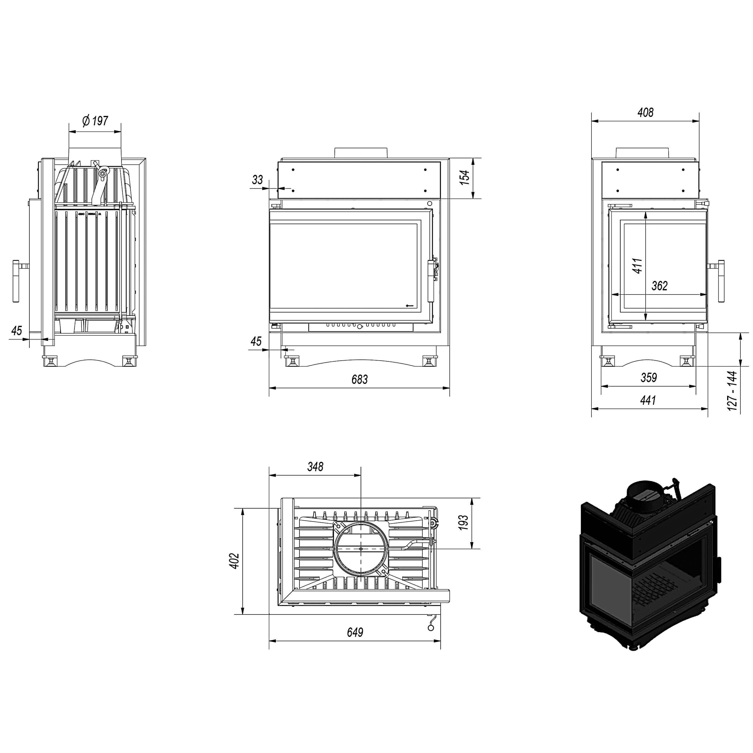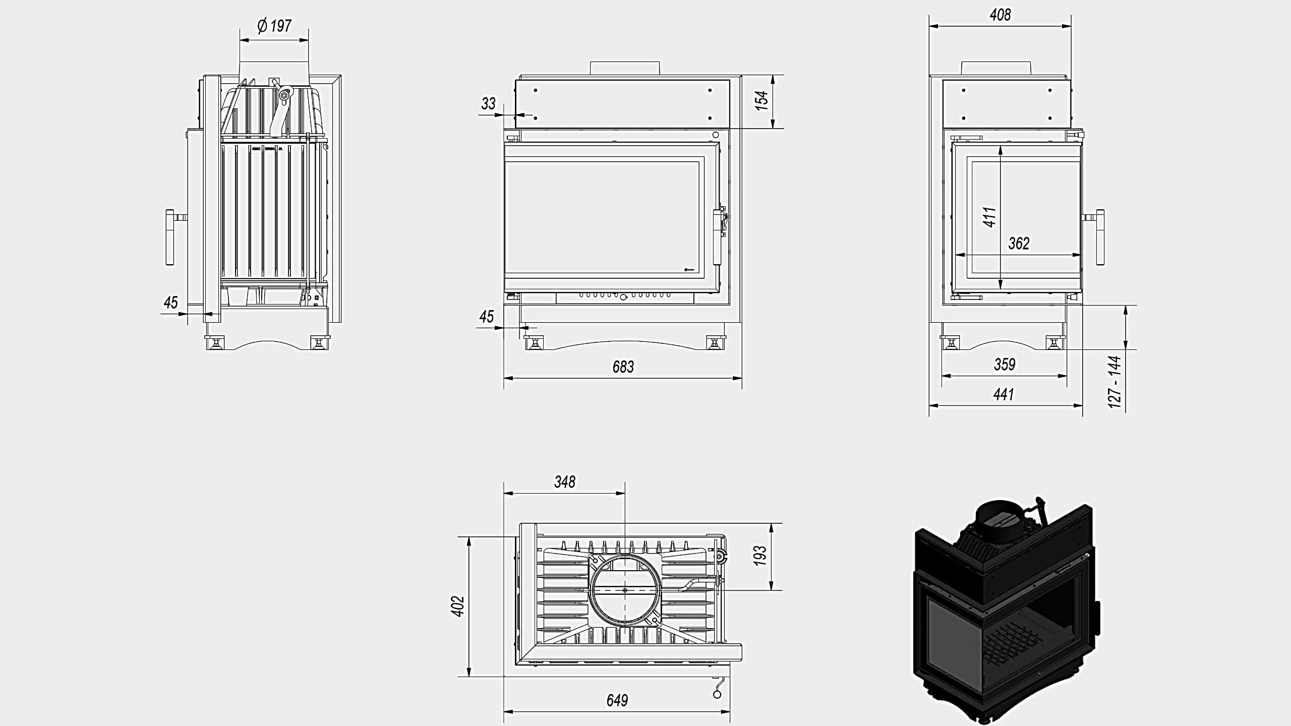 | Συνοδευτικά | Δοχείο στάχτης, Ενσωματωμένο κλαπέ καπνοδόχου, Κόφτης καυσαερίων, Μετόπη, Οδηγίες χρήσης, Προφυλακτήρας ξύλων, Πυράντοχο γάντι, Ρυθμιζόμενα πόδια, Σχάρα |