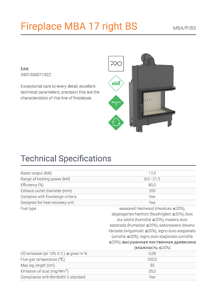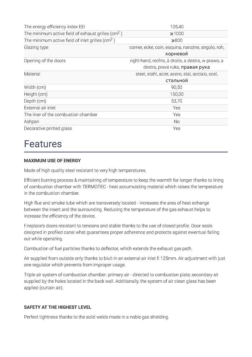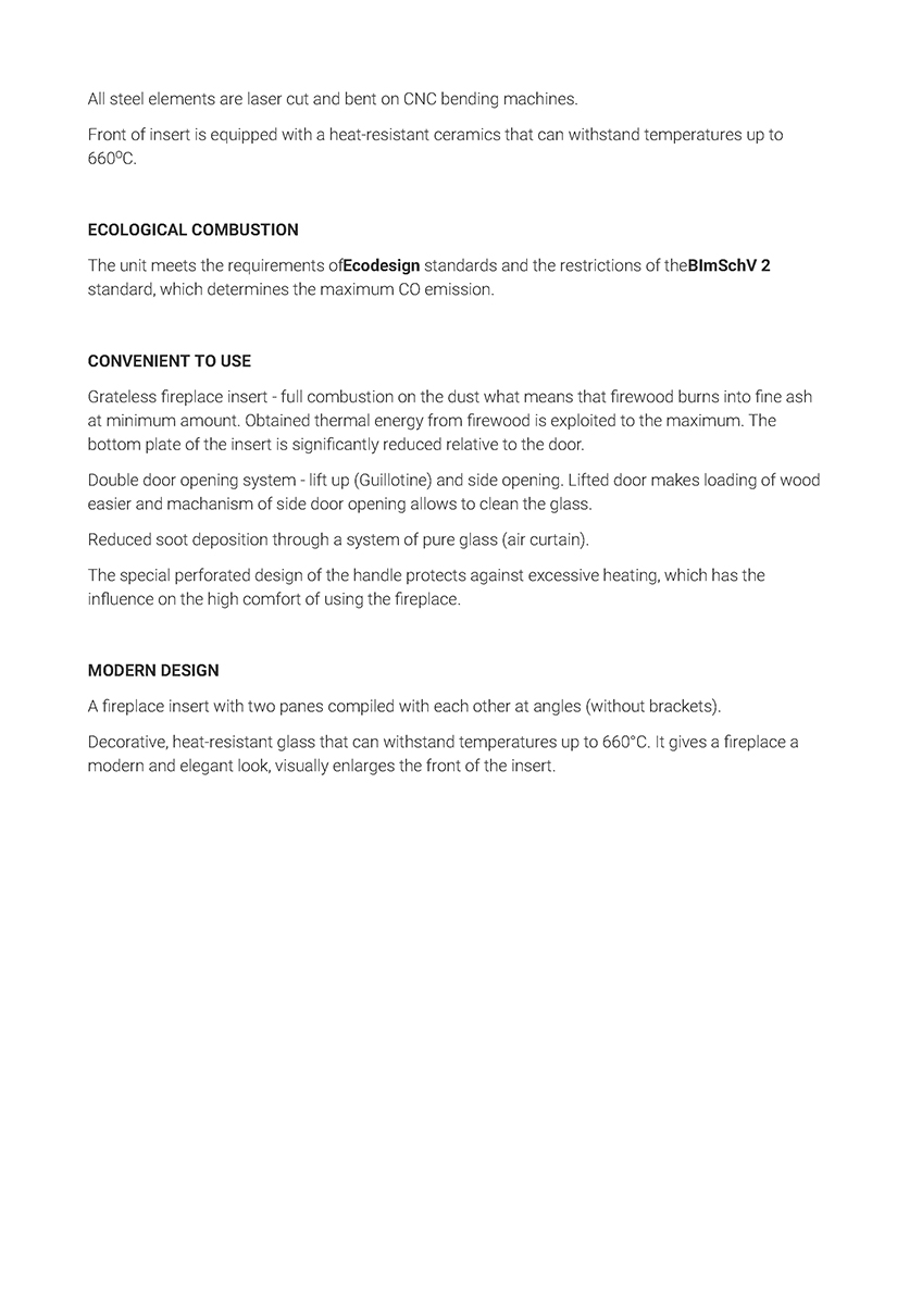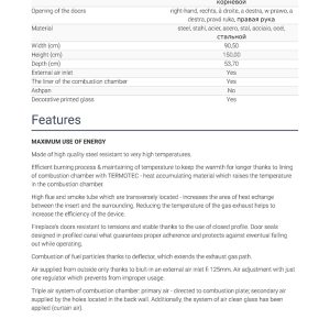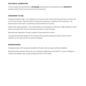 Έχει ενεργειακή κλάση Α και εσωτερική επένδυση με μαύρα κεραμικά Termotec (υλικό συσσώρευσης θερμότητας). Αποτελεί ιδανική λύση θέρμανσης για εσωτερικούς χώρους έως 200 m². Πληροί τις απαιτήσεις των προτύπων οικολογικού σχεδιασμού Ecodesign 2022 και τους περιορισμούς του προτύπου BlmSchV 2, το οποίο καθορίζει τη μέγιστη εκπομπή μονοξειδίου του άνθρακα (CO).