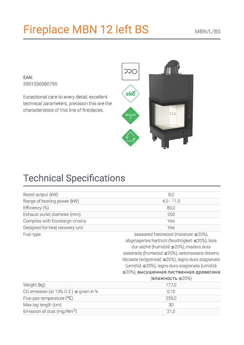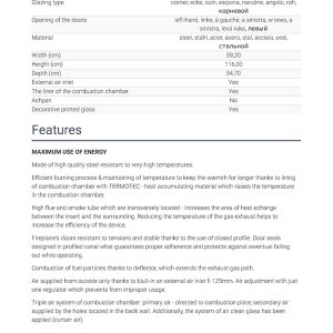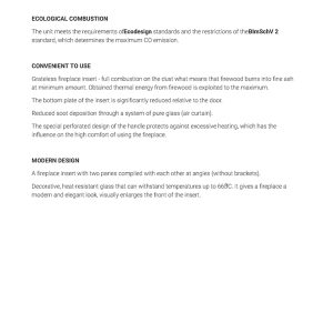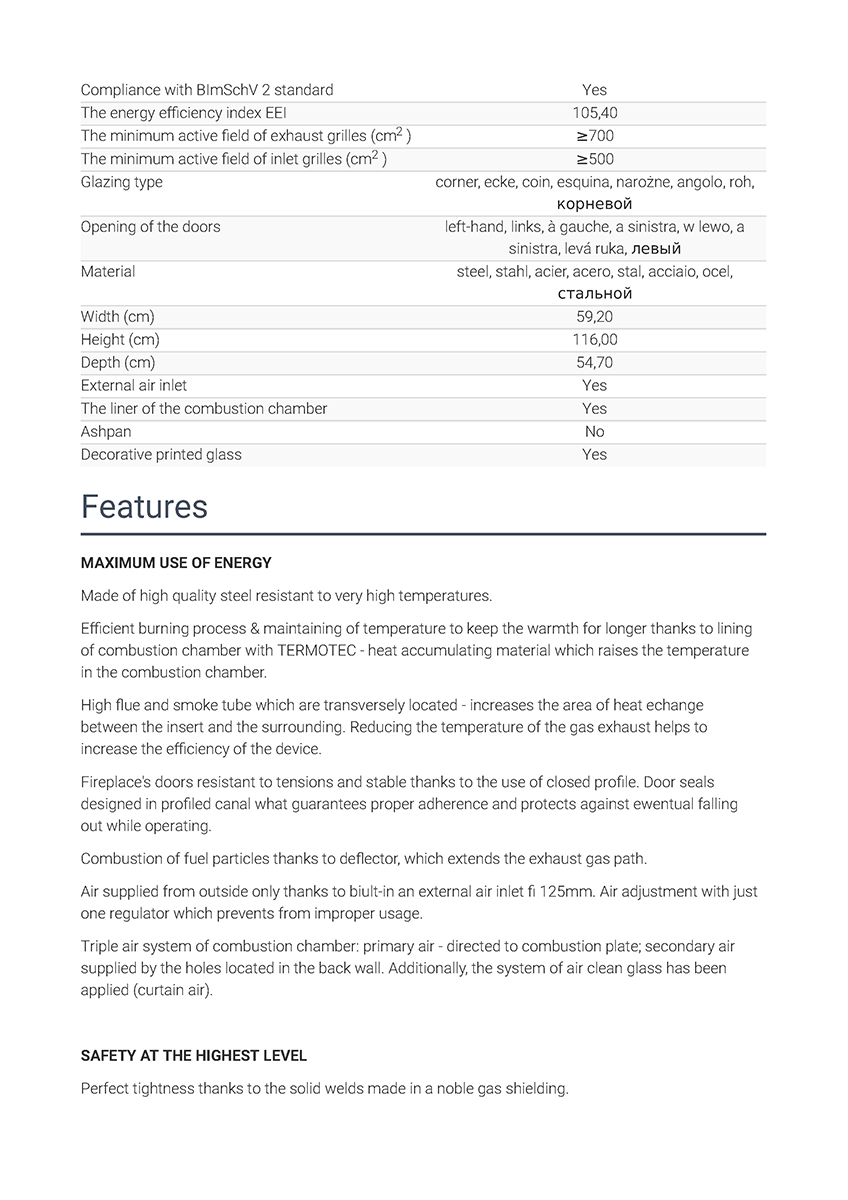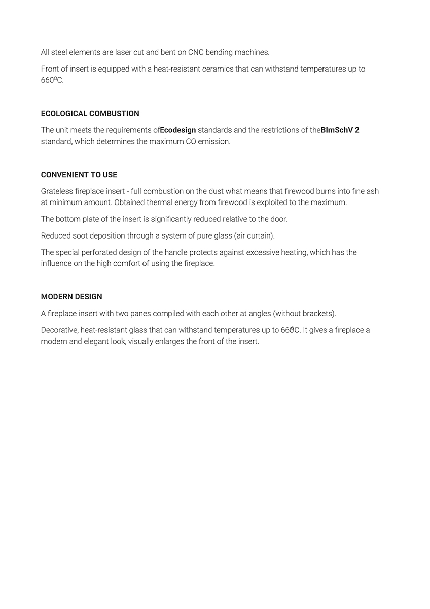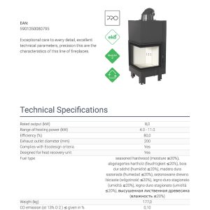 Έχει ενεργειακή κλάση Α και εσωτερική επένδυση με μαύρα κεραμικά Termotec (υλικό συσσώρευσης θερμότητας). Αποτελεί κατάλληλη λύση για εσωτερικούς χώρους έως 100 m². Πληροί τις απαιτήσεις των προτύπων οικολογικού σχεδιασμού Ecodesign 2022 και τους περιορισμούς του προτύπου BlmSchV 2, το οποίο καθορίζει τη μέγιστη εκπομπή μονοξειδίου του άνθρακα (CO).