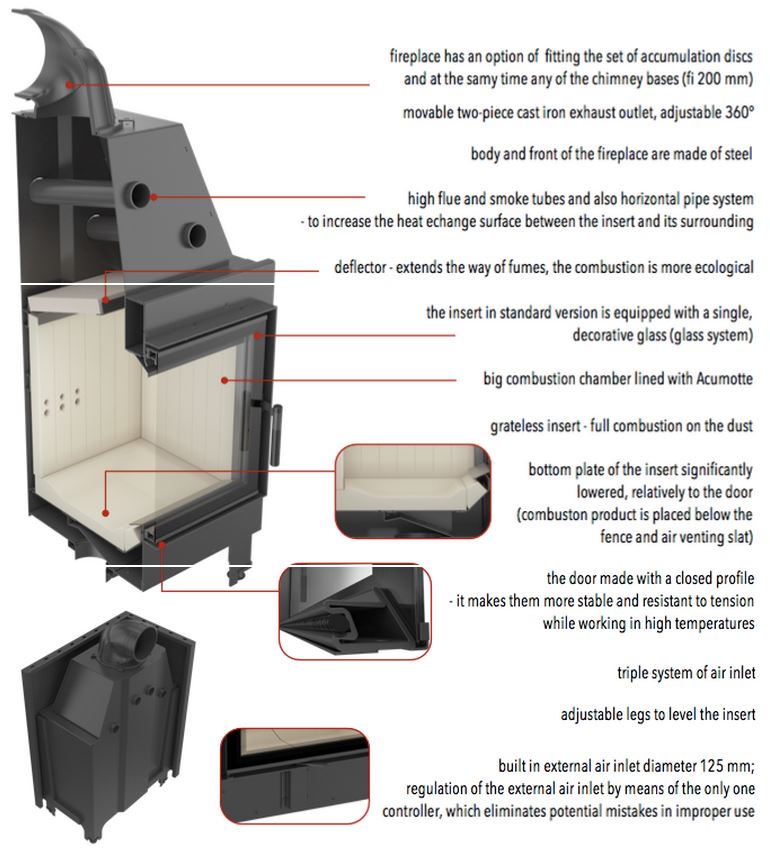 | Συνοδευτικά | Ενσωματωμένο κλαπέ εισαγωγής εξωτερικού αέρα, Επένδυση θαλάμου καύσης, Καπνοδόχος 360°, Κόφτης καυσαερίων, Οδηγίες χρήσης, Πυράντοχο γάντι, Ρυθμιζόμενα πόδια |