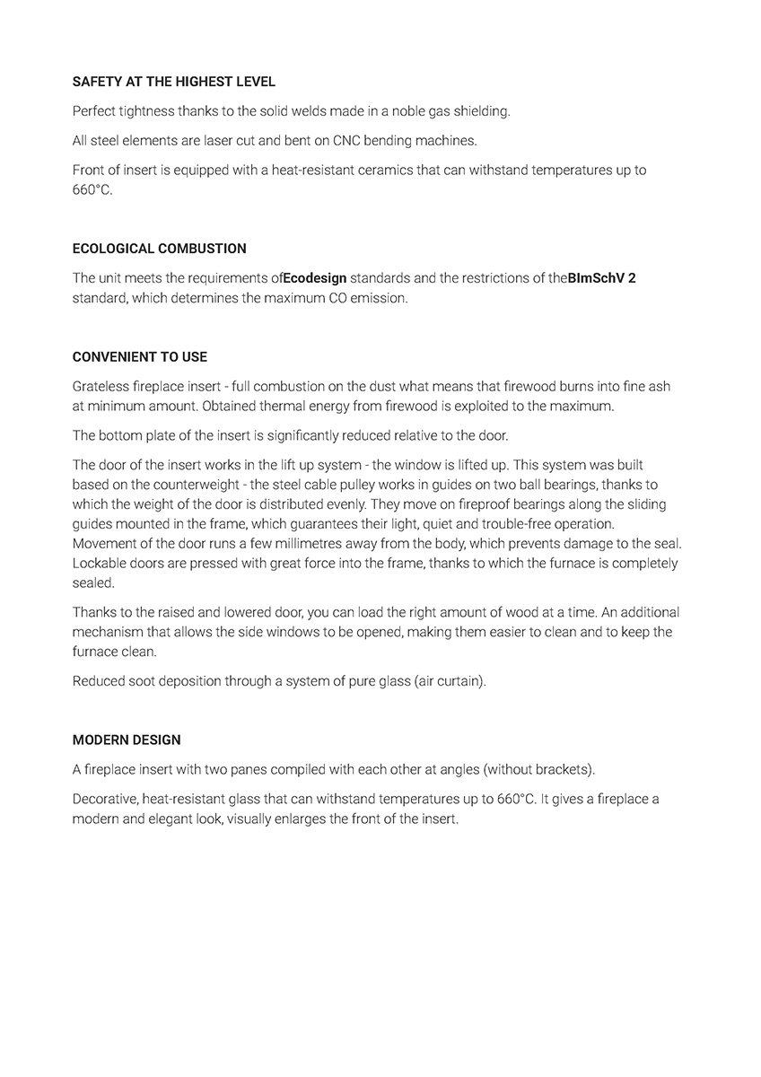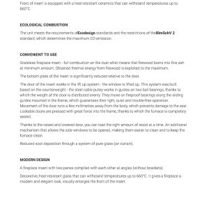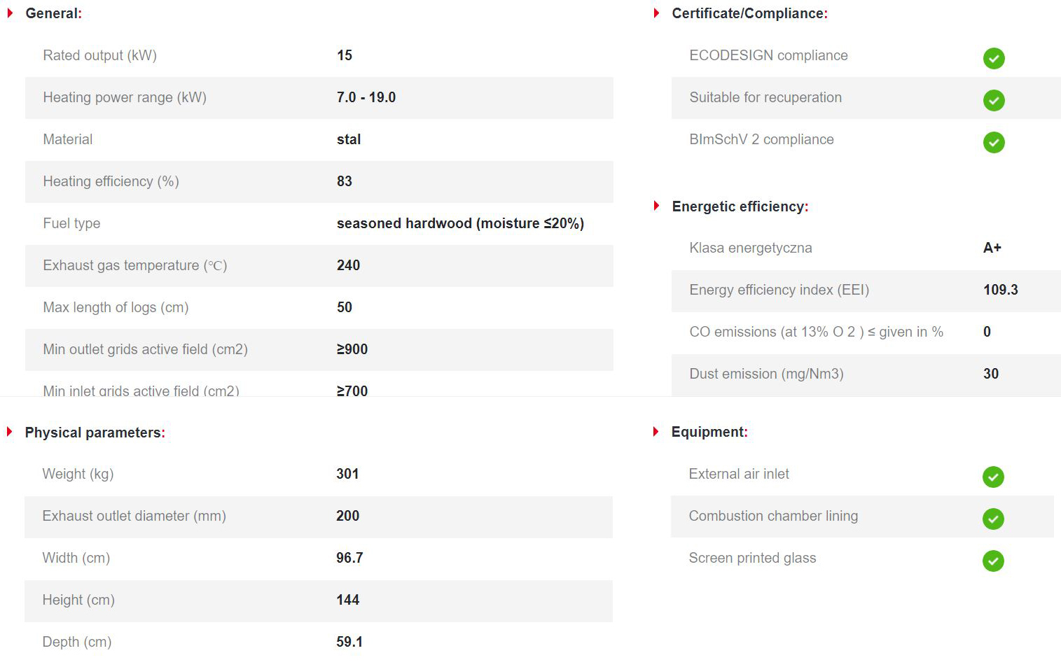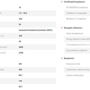 Έχει ενεργειακή κλάση Α+ και εσωτερική επένδυση με λευκά κεραμικά Termotec. Αποτελεί εξαιρετικά αποδοτικό τζάκι με χαμηλή κατανάλωση ξύλου και ελάχιστη εκπομπή ρύπων (0,09%). Με την κατάλληλη εγκατάσταση αποτελεί ιδανική λύση θέρμανσης για εσωτερικούς χώρους έως 180 m².