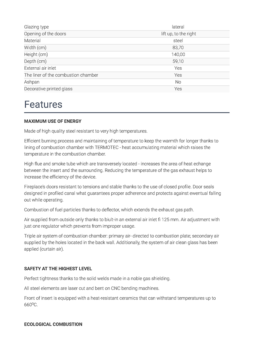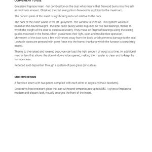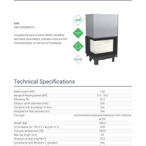 Έχει ενεργειακή κλάση Α και εσωτερική επένδυση με μαύρα κεραμικά Termotec. Αποτελεί εξαιρετικά αποδοτικό τζάκι με χαμηλή κατανάλωση ξύλου και ελάχιστη εκπομπή ρύπων (0,09%). Με την κατάλληλη εγκατάσταση αποτελεί ιδανική λύση θέρμανσης για εσωτερικούς χώρους έως 150 m².