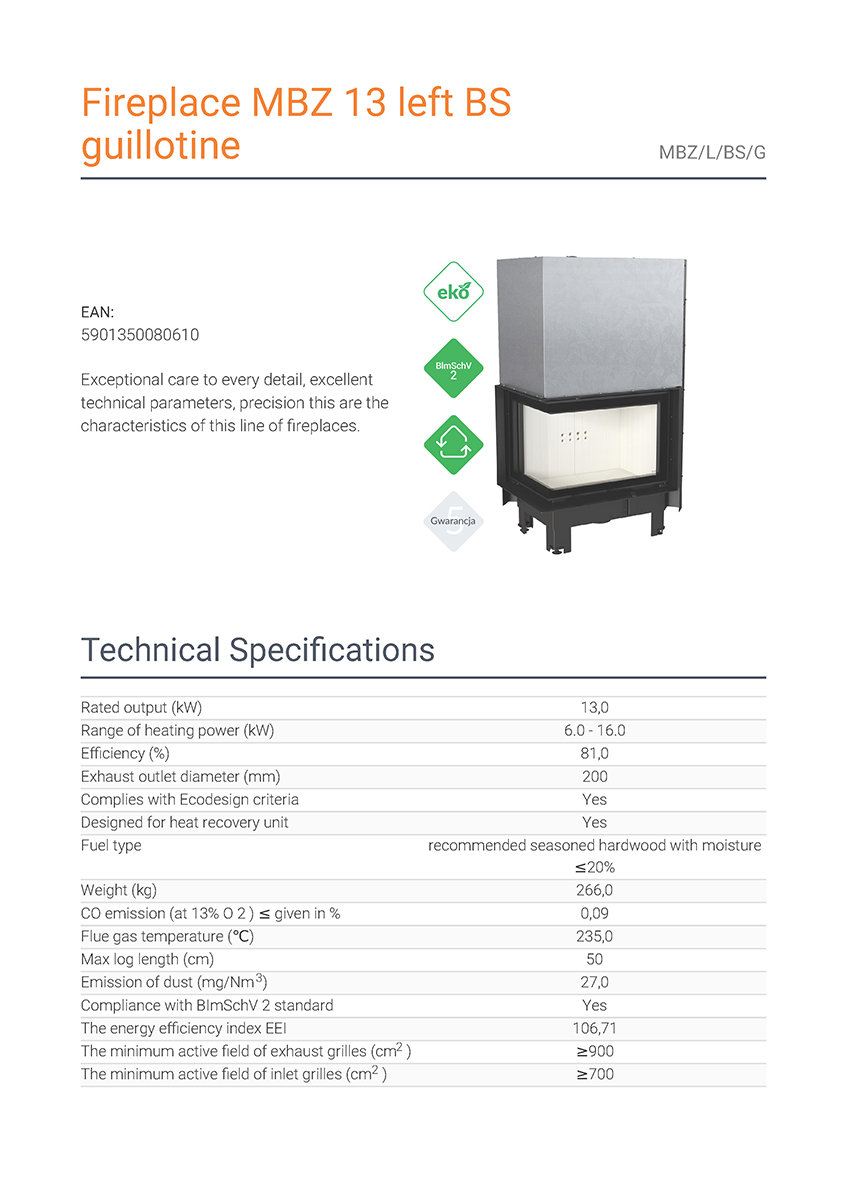 Το Kratki MBZ L BS G Black αποτελεί ενεργειακό τζάκι ξύλου από χάλυβα, δυο όψεων με αριστερή γωνία. Διαθέτει ισχύ 13kW, θερμική απόδοση 81%, ανοιγόμενη και συρόμενη πόρτα, καθώς και θερμοανθεκτικό κεραμικό κρύσταλλο, διακοσμημένο με μεταξοτυπία.