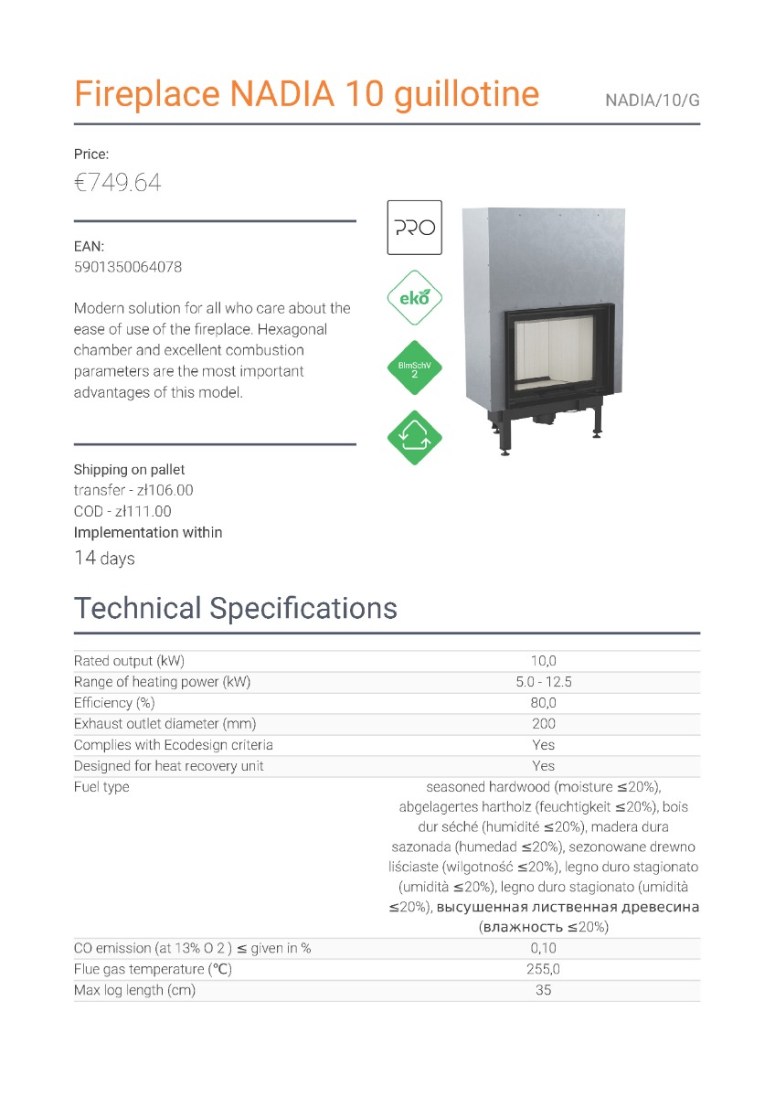 Το Kratki Nadia 10 G Black αποτελεί ίσιο ενεργειακό τζάκι ξύλου από χάλυβα. Διαθέτει ισχύ 5-12.5 kW, θερμική απόδοση 80%, ανοιγόμενη και συρόμενη πόρτα, καθώς και θερμοανθεκτικό κεραμικό κρύσταλλο, διακοσμημένο με μεταξοτυπία.