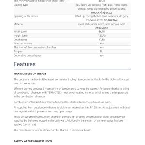 Έχει ενεργειακή κλάση Α και εσωτερική επένδυση με μαύρα κεραμικά Termotec. Αποτελεί αποδοτικό τζάκι με ελάχιστη κατανάλωση ξύλου και ελάχιστη εκπομπή ρύπων (0.08%). Με την κατάλληλη εγκατάσταση αποτελεί ιδανική λύση θέρμανσης για εσωτερικούς χώρους έως 125 m².