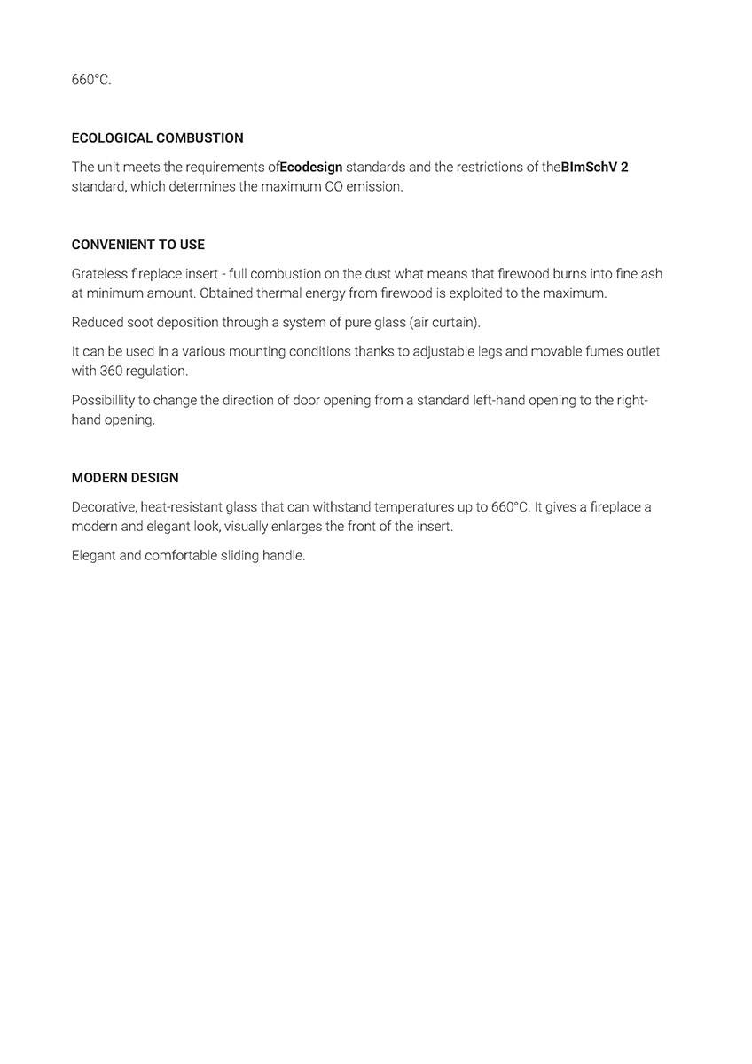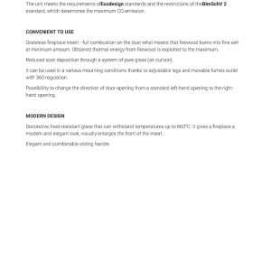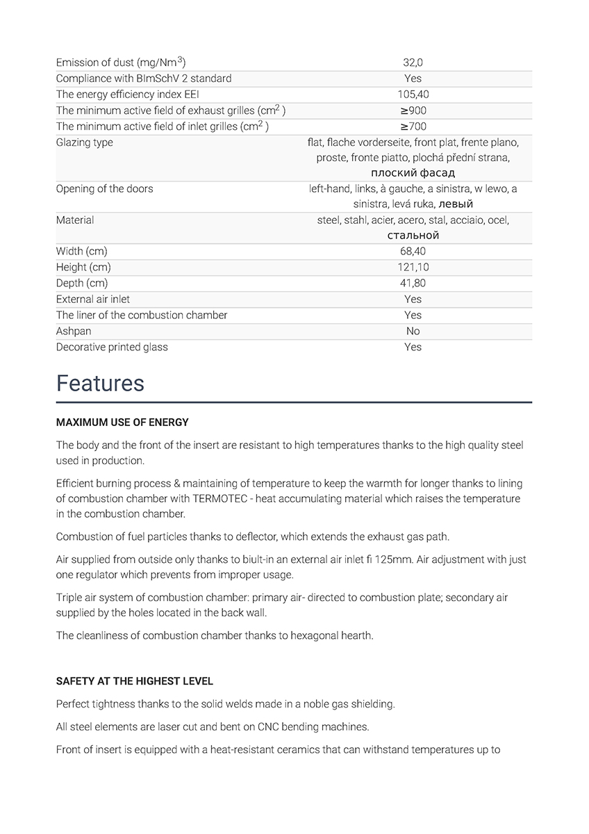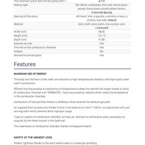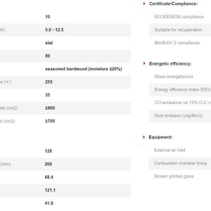 Έχει ενεργειακή κλάση Α και εσωτερική επένδυση με λευκά κεραμικά Termotec. Αποτελεί αποδοτικό τζάκι με ελάχιστη κατανάλωση ξύλου και ελάχιστη εκπομπή ρύπων (0.08%). Με την κατάλληλη εγκατάσταση αποτελεί ιδανική λύση θέρμανσης για εσωτερικούς χώρους έως 125 m².