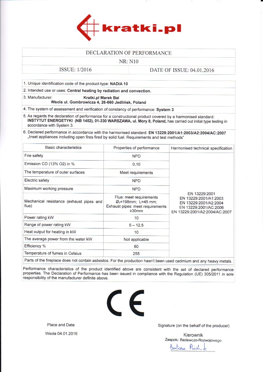 Το Kratki Nadia 10 αποτελεί ίσιο ενεργειακό τζάκι ξύλου από χάλυβα. Διαθέτει ονομαστική ισχύ 5-12.5 kW, θερμική απόδοση 80%, ανοιγόμενη πόρτα και θερμοανθεκτικό κεραμικό κρύσταλλο, διακοσμημένο με μεταξοτυπία.