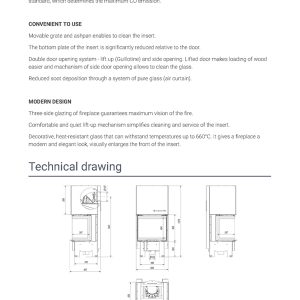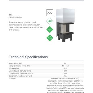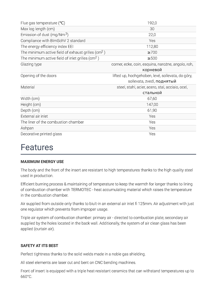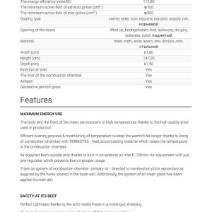 Έχει Ενεργειακή Κλάση Α+ και εσωτερική επένδυση με λευκά κεραμικά Termotec. Αποτελεί εξαιρετικά αποδοτικό τζάκι με χαμηλή κατανάλωση ξύλου και ελάχιστη εκπομπή ρύπων (0.08%). Με την κατάλληλη εγκατάσταση αποτελεί ιδανική λύση θέρμανσης για εσωτερικούς χώρους έως 110 m².
