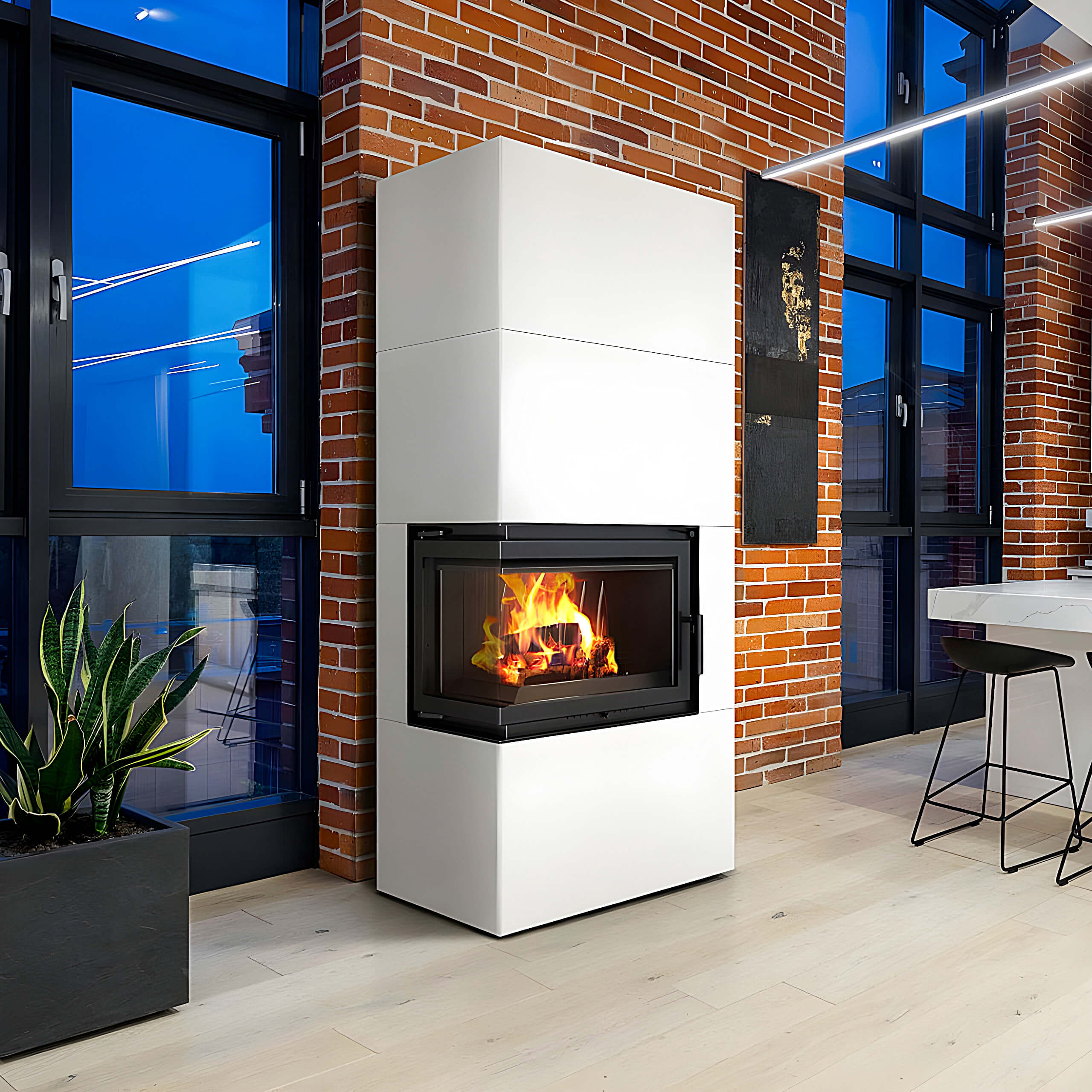 Simple Box L S Bianco 3-10 kW Μαντεμένιο Ενεργειακό Τζάκι Ξύλου Αριστερή Γωνία με Ανοιγόμενη Πόρτα και Λευκή Μεταλλική Διακόσμηση Επιδαπέδιο Αερόθερμο Kratki