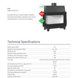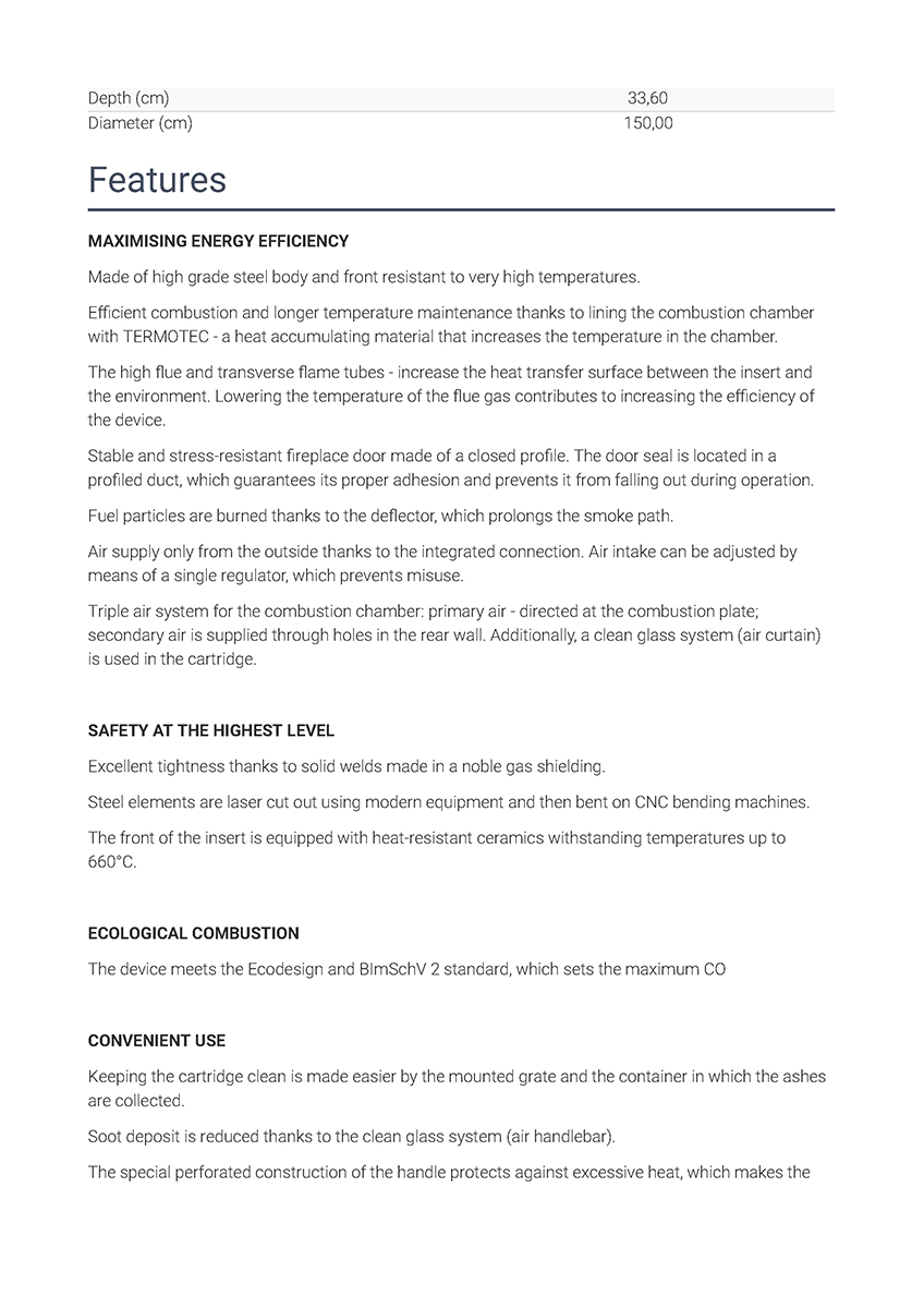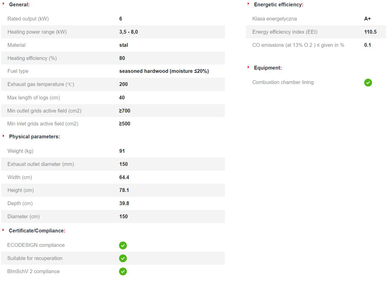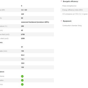 Έχει ενεργειακή κλάση Α+ και εσωτερική επένδυση με λευκά κεραμικά Termotec. Αποτελεί κατάλληλη λύση για εσωτερικούς χώρους έως 70 m². Πληροί τις προϋποθέσεις των προτύπων Ecodesign 2022 και τους περιορισμούς του προτύπου BlmSchV 2, το οποίο καθορίζει τη μέγιστη εκπομπή CO.
