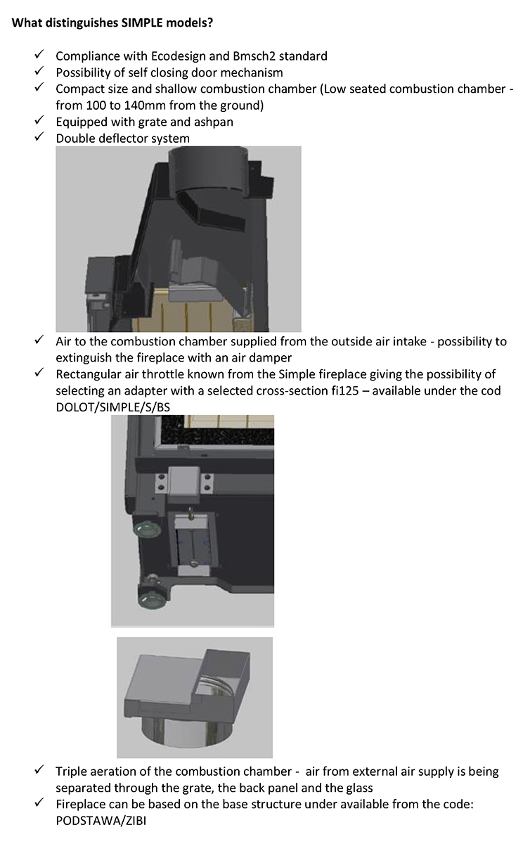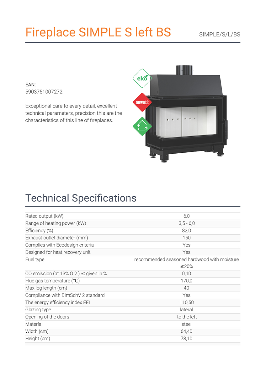 Το Kratki Simple S L BS αποτελεί ενεργειακό τζάκι ξύλου αερόθερμο, κατασκευασμένο από χάλυβα. Διαθέτει ισχύ 6kW, θερμική απόδοση 80%, αριστερή γωνία με ανοιγόμενη πόρτα από χάλυβα και ανθεκτικό κεραμικό κρύσταλλο, τυπωμένο με μεταξοτυπία.