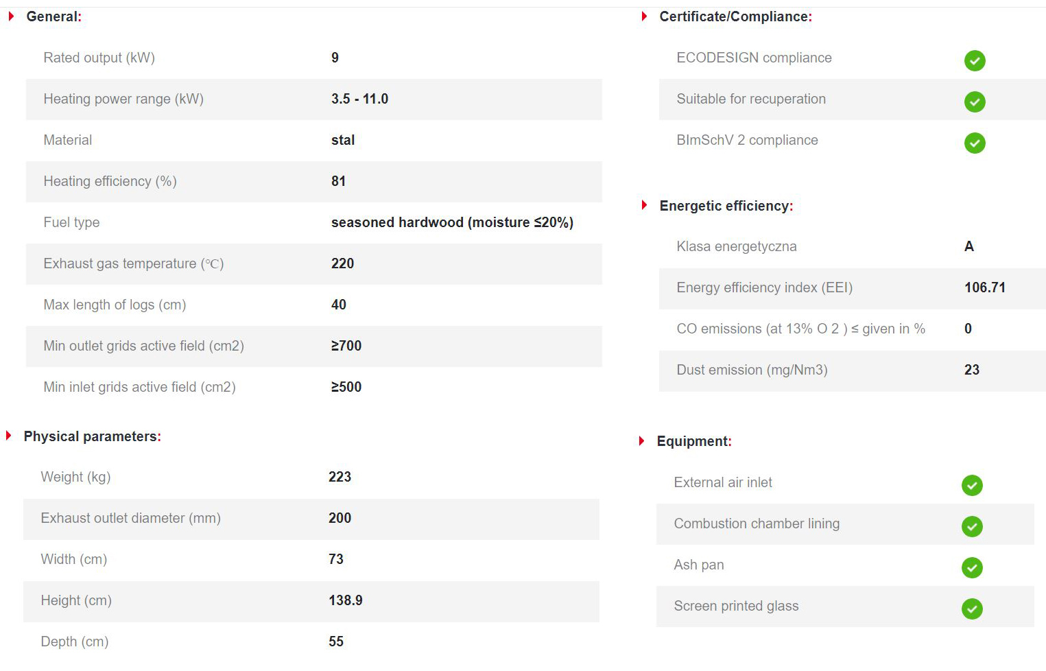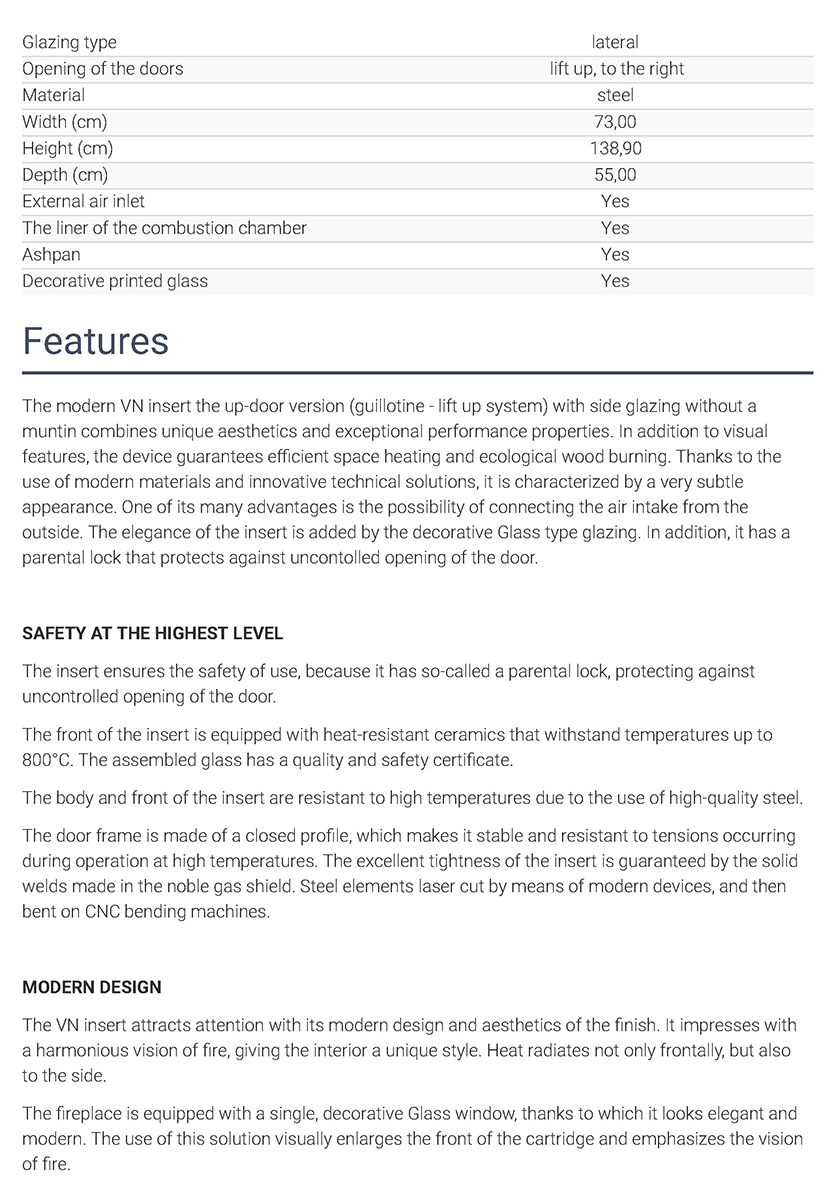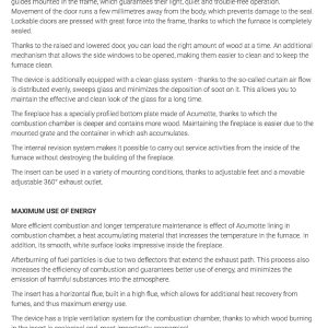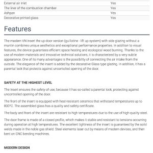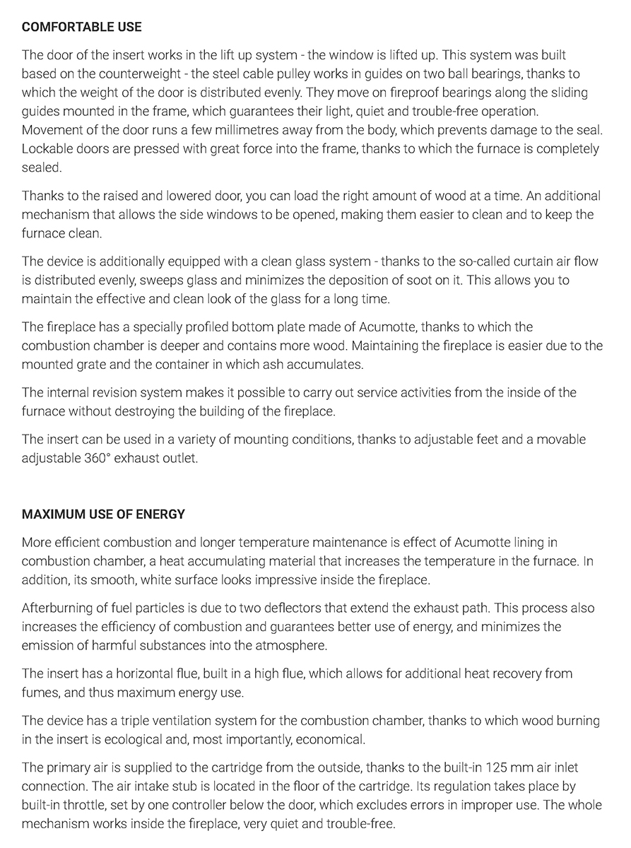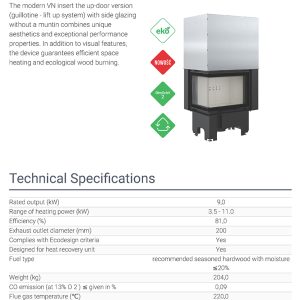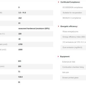 Έχει ενεργειακή κλάση Α και εσωτερική επένδυση με μαύρα κεραμικά Termotec. Αποτελεί πολύ αποδοτικό τζάκι με πολύ χαμηλή κατανάλωση ξύλου (2,3 kg/h) και ελάχιστη εκπομπή ρύπων (0,08%). Με την κατάλληλη εγκατάσταση αποτελεί ιδανική λύση θέρμανσης για εσωτερικούς χώρους έως 110 m².