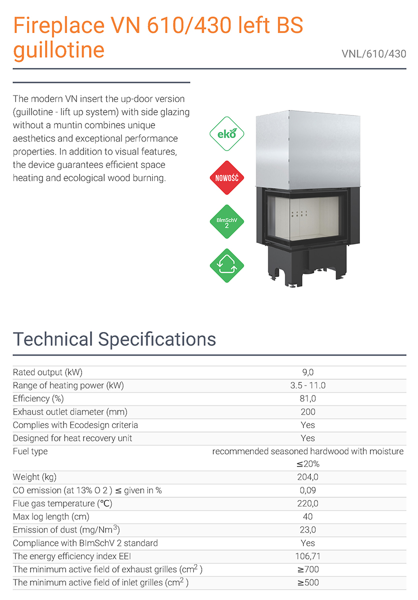 Το Kratki VNL 610 430 Black αποτελεί ενεργειακό τζάκι ξύλου από χάλυβα, δύο όψεων με αριστερή γωνία. Διαθέτει ονομαστική ισχύ 9kW, θερμική απόδοση 81%, ανοιγόμενη και συρόμενη πόρτα, καθώς και μοντέρνο θερμοανθεκτικό κεραμικό κρύσταλλο, διακοσμημένο με μεταξοτυπία.