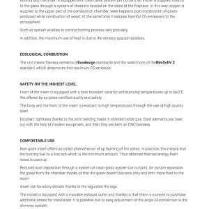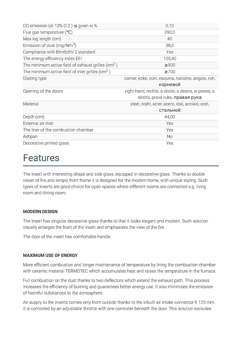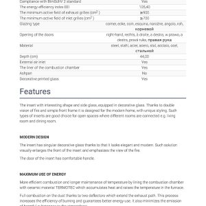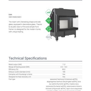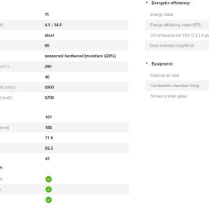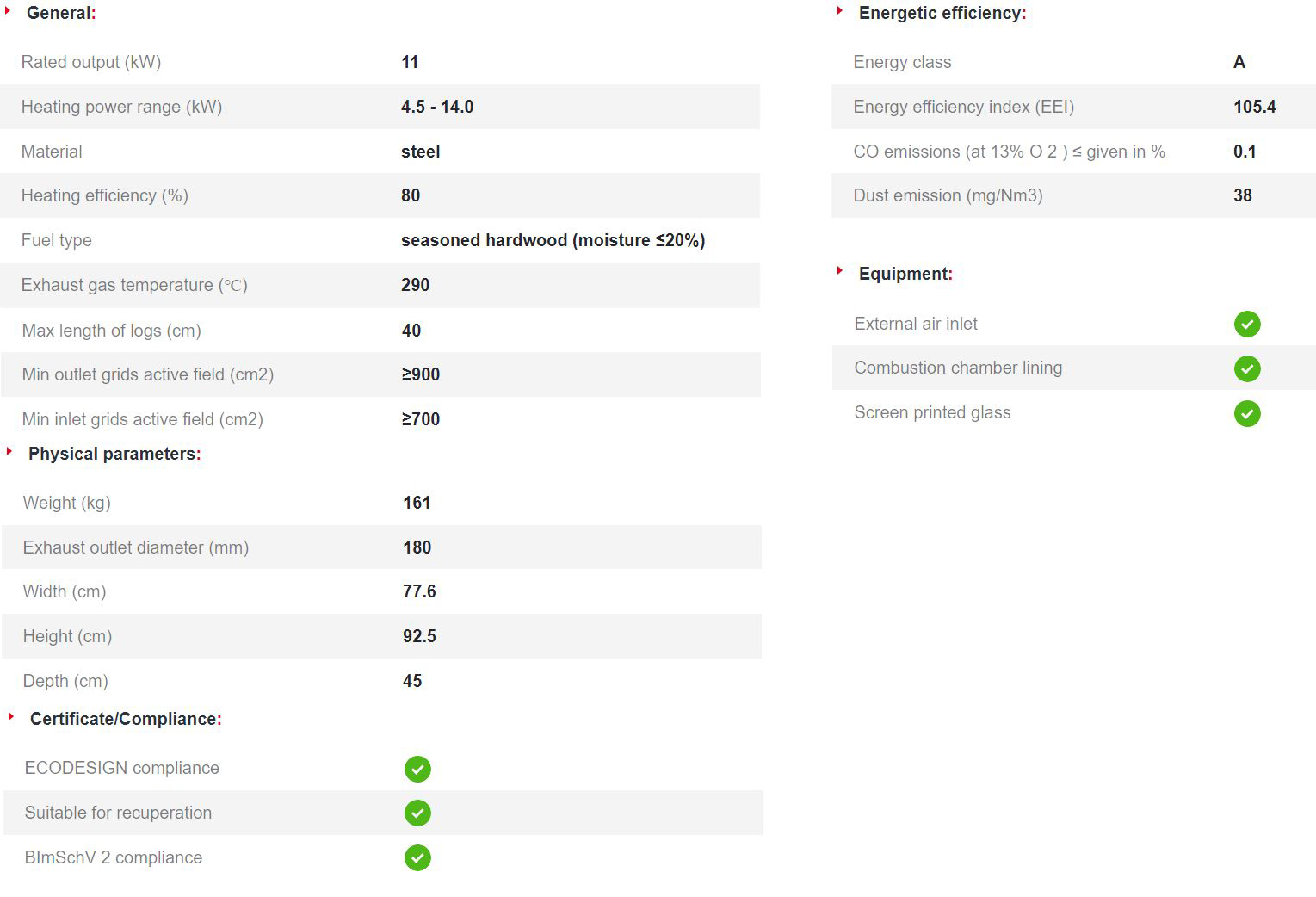 Έχει ενεργειακή κλάση Α και εσωτερική επένδυση με λευκά κεραμικά Termotec. Αποτελεί αποδοτικό τζάκι με χαμηλή κατανάλωση ξύλου και ελάχιστη εκπομπή ρύπων (0,09%). Με την κατάλληλη εγκατάσταση αποτελεί ιδανική λύση θέρμανσης για εσωτερικούς χώρους έως 130 m².