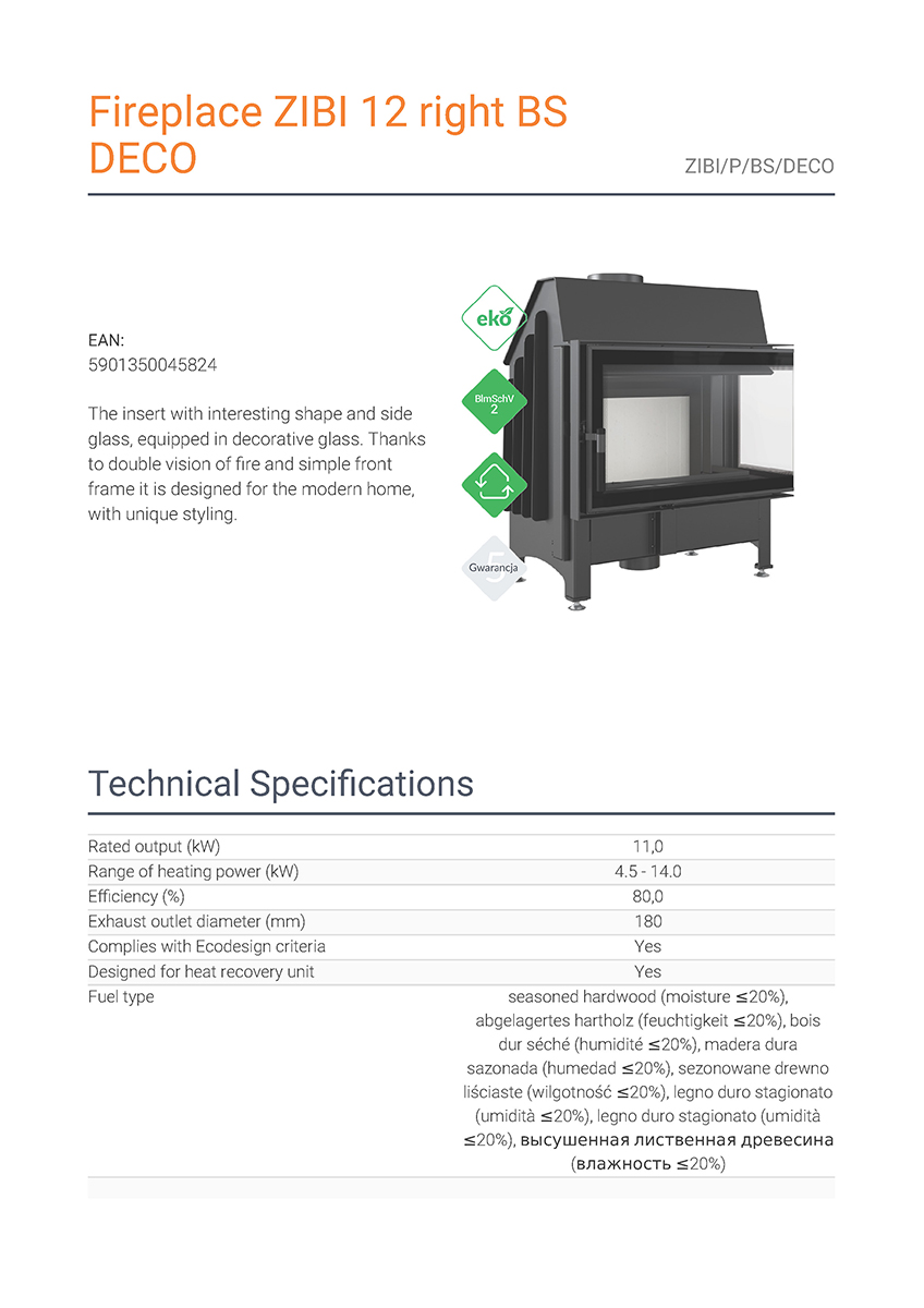 Το Kratki Zibi P BS Deco αποτελεί ενεργειακό τζάκι ξύλου από χάλυβα, δυο όψεων με δεξιά γωνία. Διαθέτει ισχύ 11kW, θερμική απόδοση 80%, ανοιγόμενη πόρτα και θερμοανθεκτικό κεραμικό κρύσταλλο, διακοσμημένο με μεταξοτυπία.