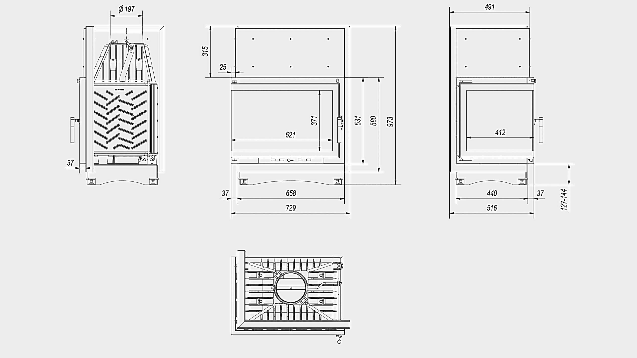 | Συνοδευτικά | Δοχείο στάχτης, Ενσωματωμένο κλαπέ καπνοδόχου, Κόφτης καυσαερίων, Μετόπη, Οδηγίες χρήσης, Προφυλακτήρας ξύλων, Πυράντοχο γάντι, Ρυθμιζόμενα πόδια, Σχάρα |