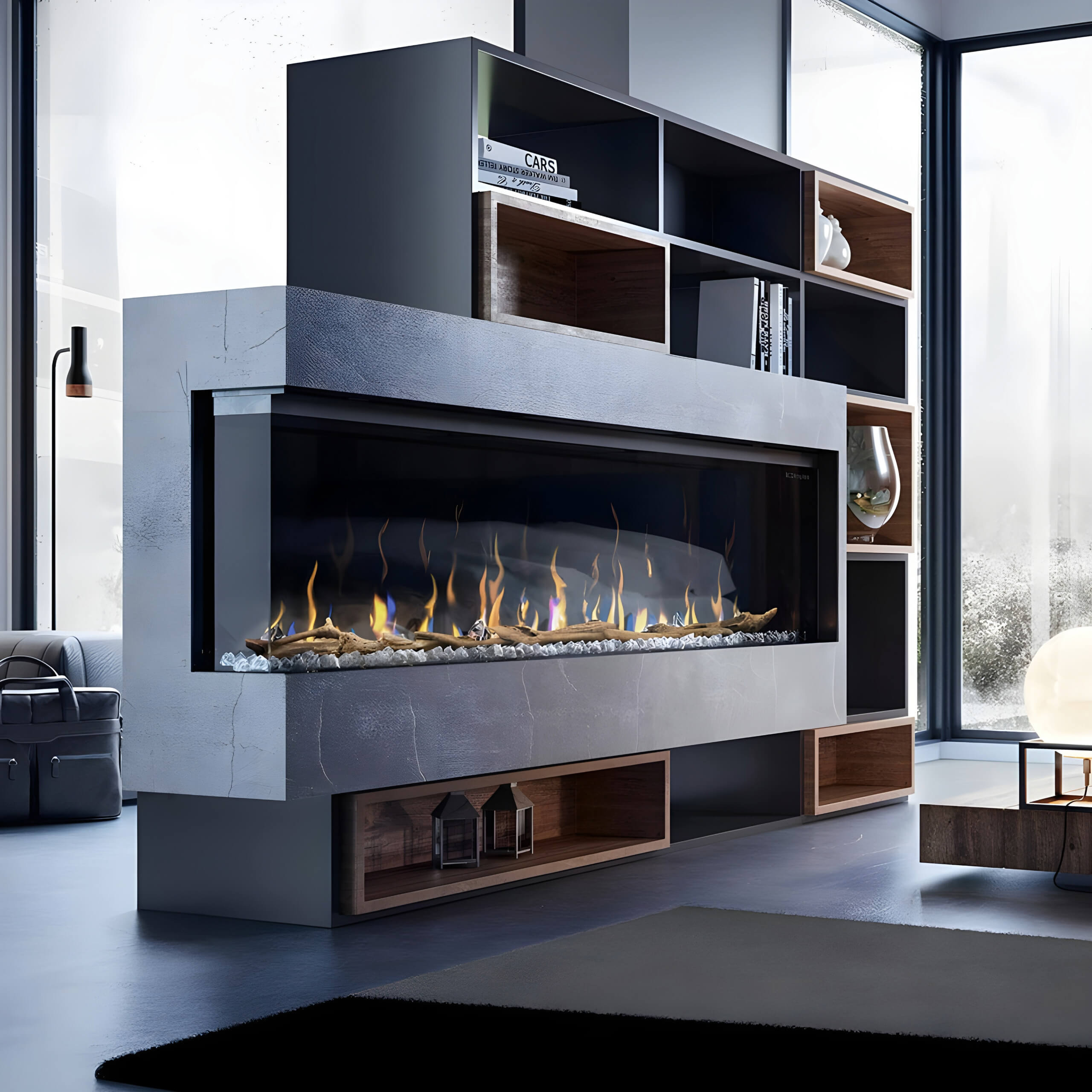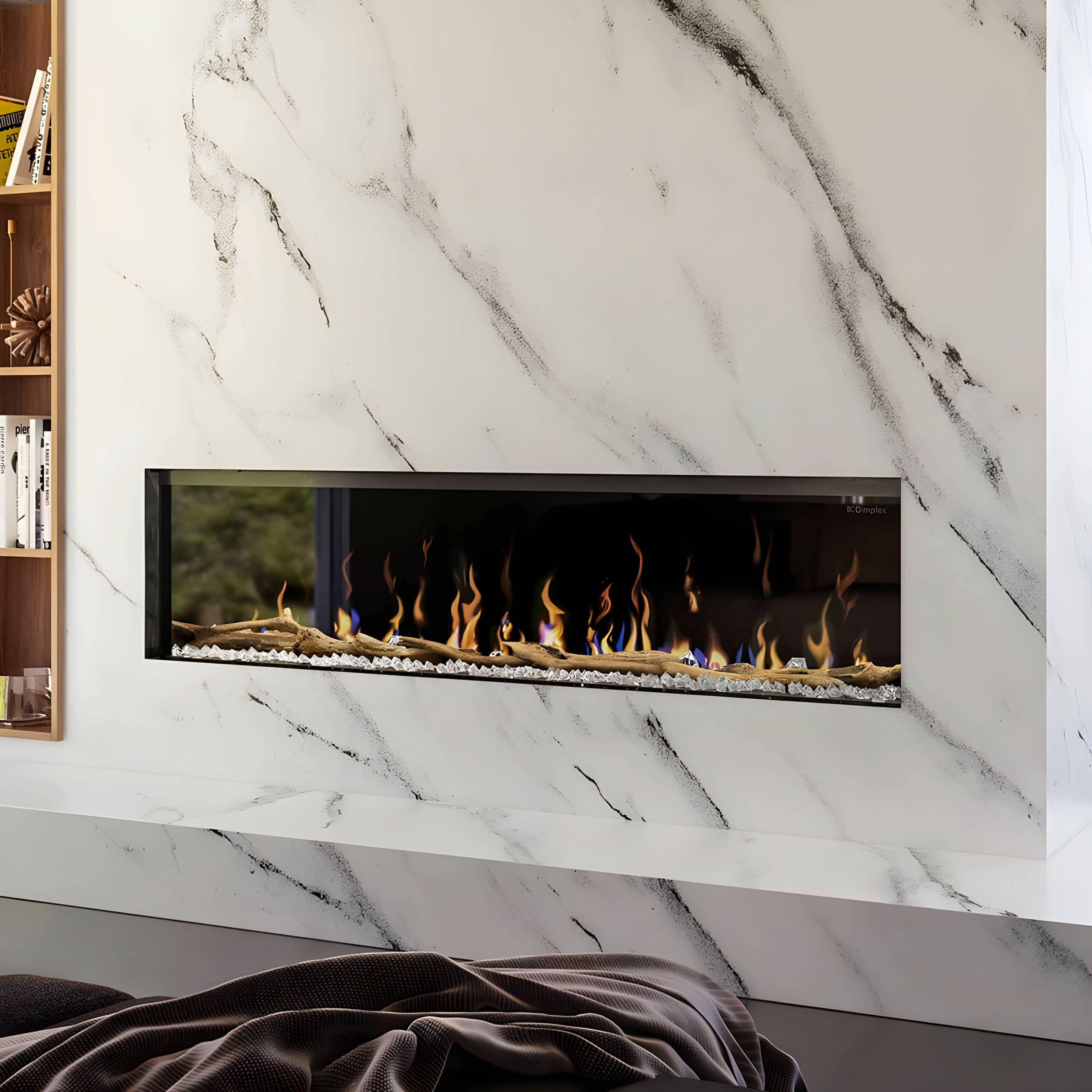 Συνοδεύεται από ένα κομψό σετ κούτσουρων και ένα στρώμα από γυάλινους κρυστάλλους, προσθέτοντας στον ρεαλισμό και την οπτική ελκυστικότητα της φλόγας. Ο συνδυασμός αυτών των στοιχείων δημιουργεί μια εντυπωσιακή και εκλεπτυσμένη εμφάνιση που συμπληρώνει κάθε εσωτερική διακόσμηση