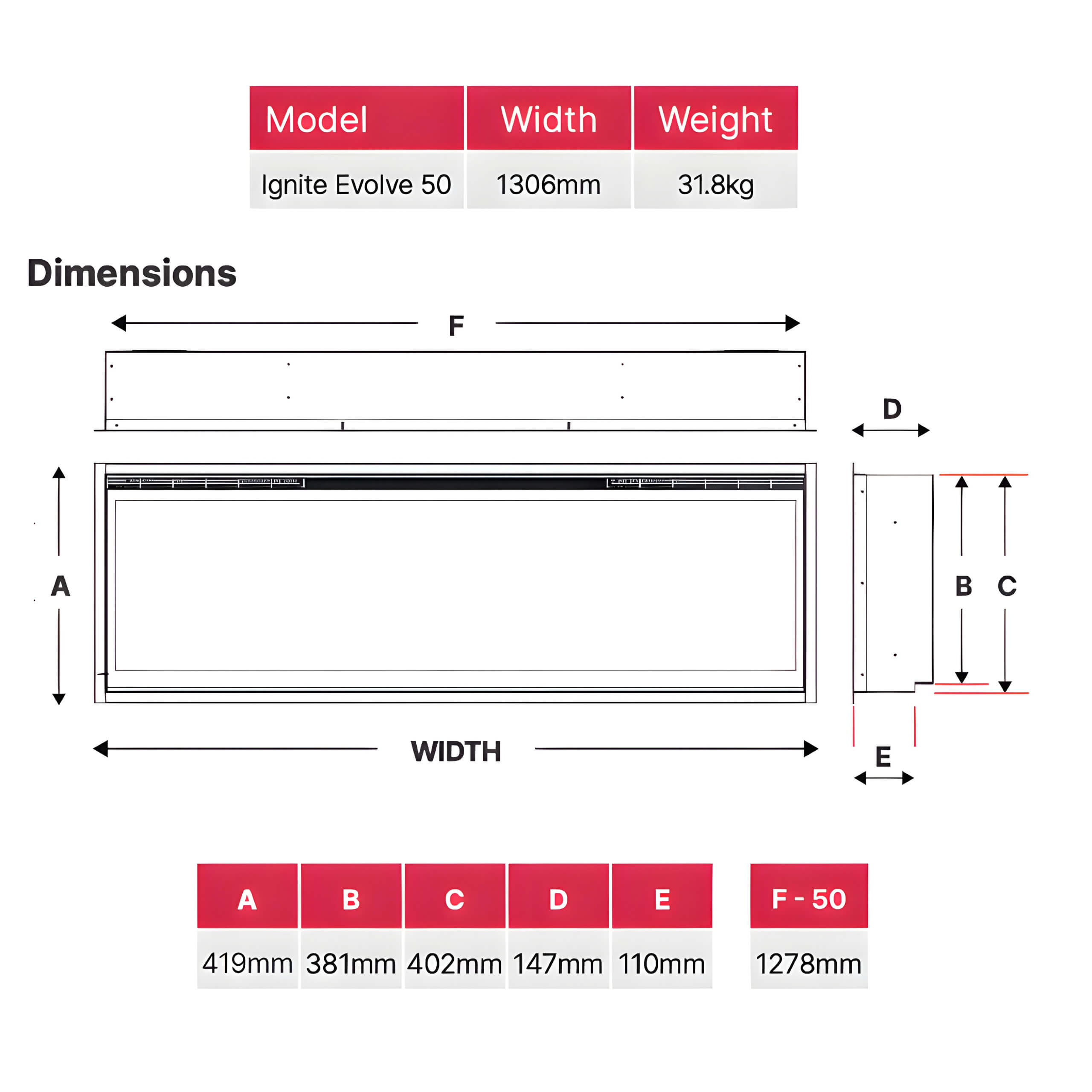 Βασικά χαρακτηριστικά Dimplex Ignite Evolve 50