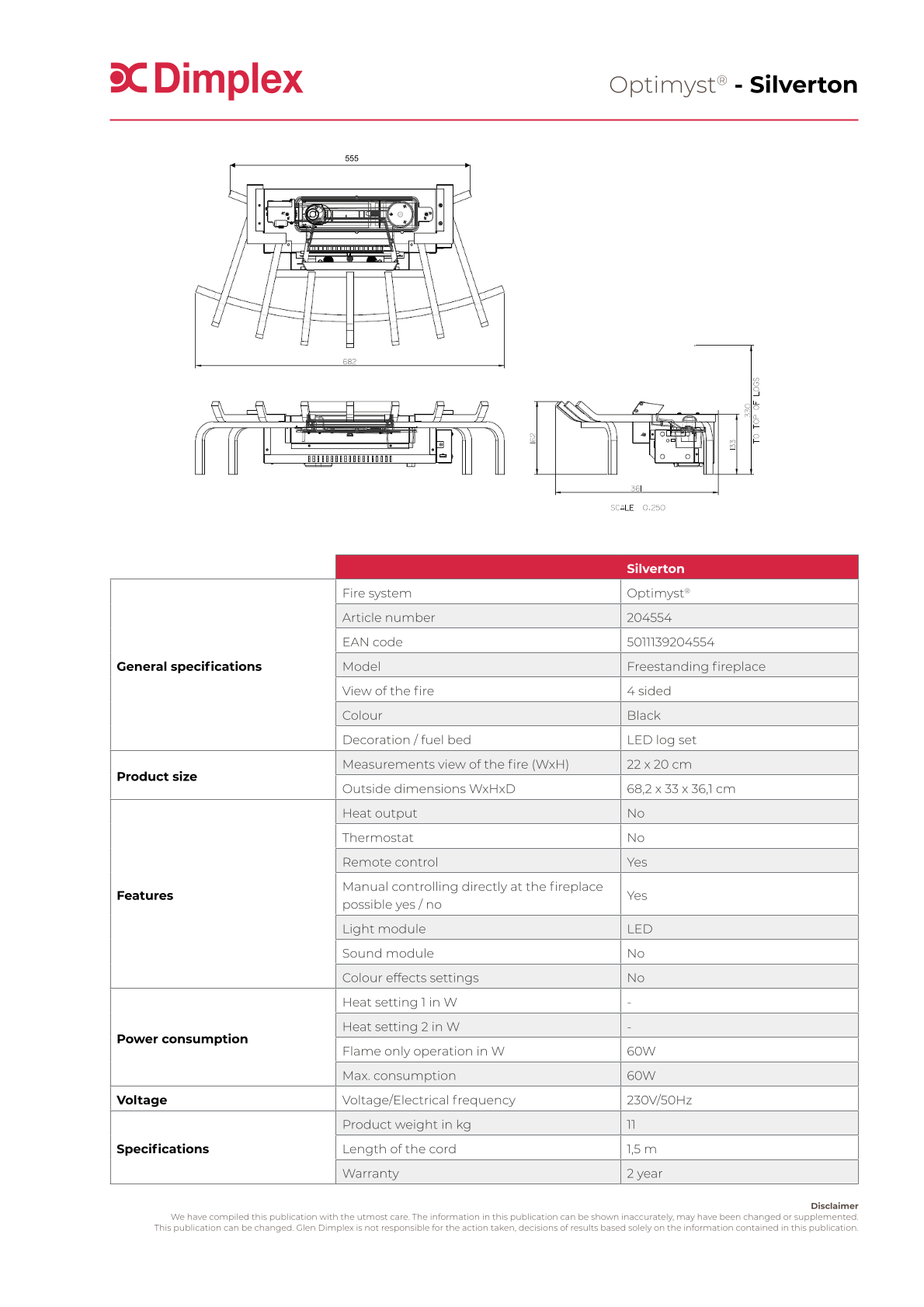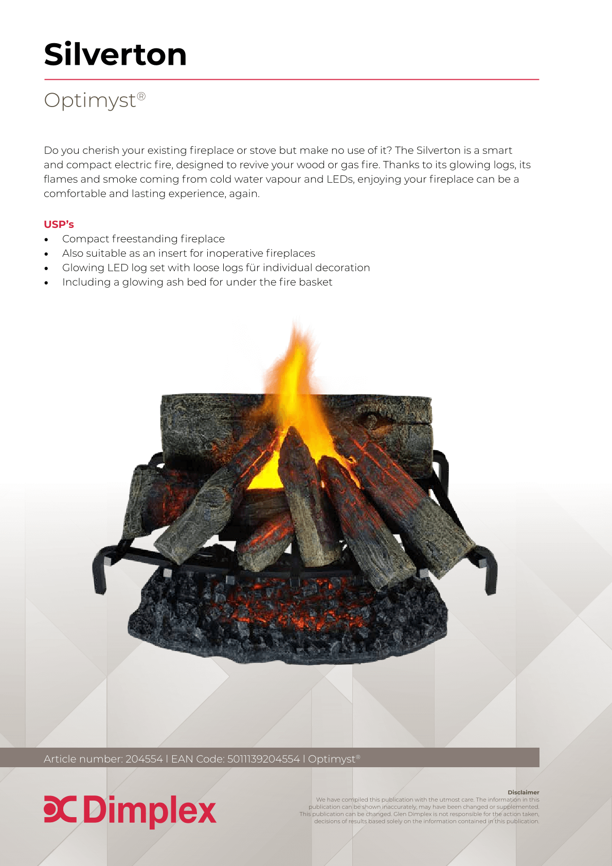 Το ηλεκτρικό τζάκι ατμού Dimplex Silverton είναι ίσως η πιο εντυπωσιακή συσκευή προσομοίωσης ενός πραγματικού τζακιού με καύση ξύλων. Είναι ένα τζάκι που αποτελείται από μία μεταλλική σχάρα, ρεαλιστικά ξύλα με εσωτερικό φωτισμό LED, χόβολη με ρεαλιστική αναπαράσταση στάχτης και κάρβουνα που σιγοκαίνε. Χρησιμοποιεί την πατενταρισμένη τεχνολογία Dimplex Optimyst με καπνό από την εξάτμιση του νερού. Σε συνδυασμό με τον κρυφό φωτισμό LED και τα ξύλα, η εικονική τρισδιάστατη φλόγα είναι τόσο ρεαλιστική που προσομοιάζει με μία πραγματική καύση φωτιάς. Είναι ιδανικό για τοποθέτηση σε ένα υπάρχον τζάκι, που πλέον δε χρησιμοποιείται, χαρίζοντας ένα ζεστό ατμοσφαιρικό φωτισμό στο χώρο σας. Διαθέτει τηλεκοντρόλ απομακρυσμένης λειτουργίας.