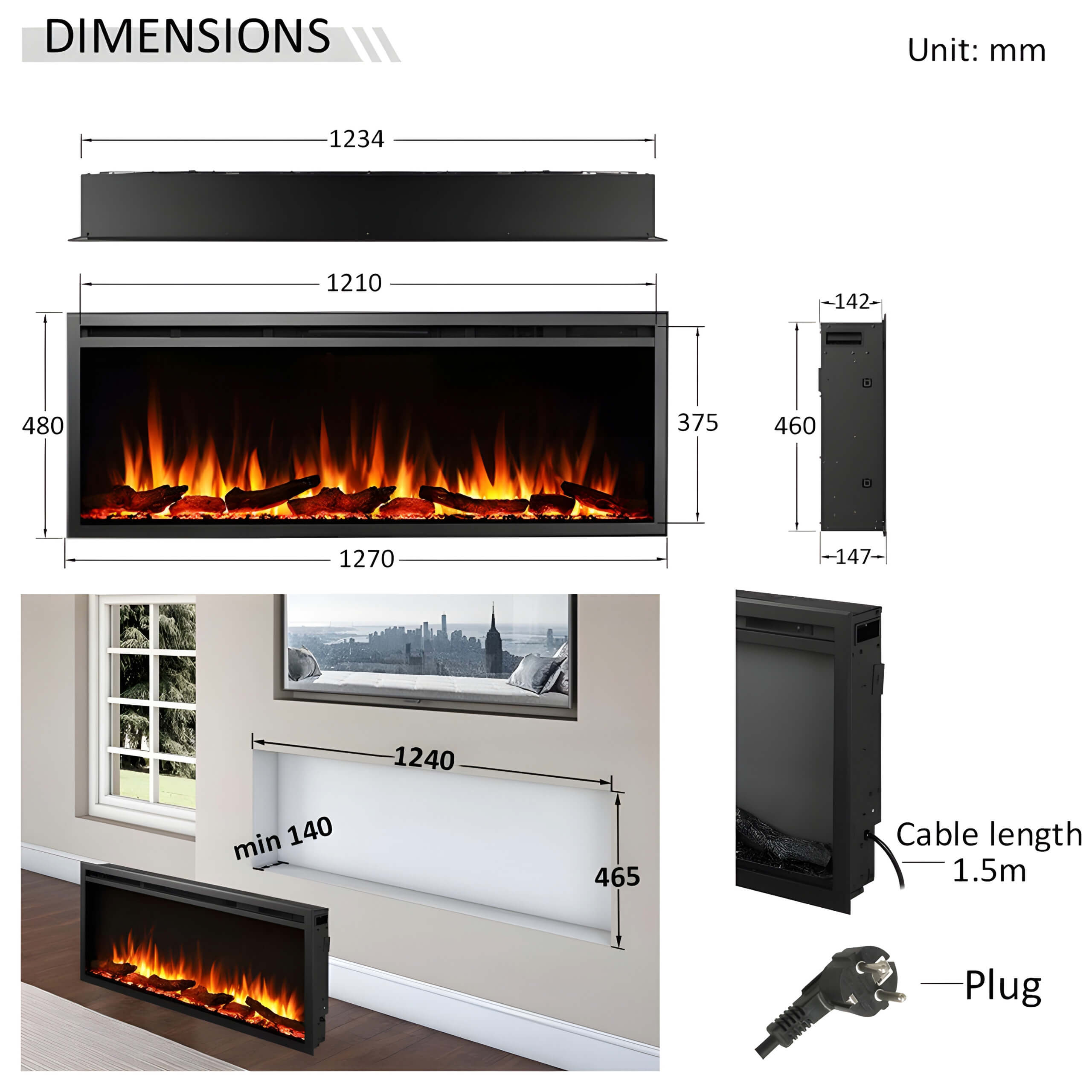 Διαστάσεις εντοιχισμού: 124 × 46,5 × 14,7 cm (Π×Υ×Β)