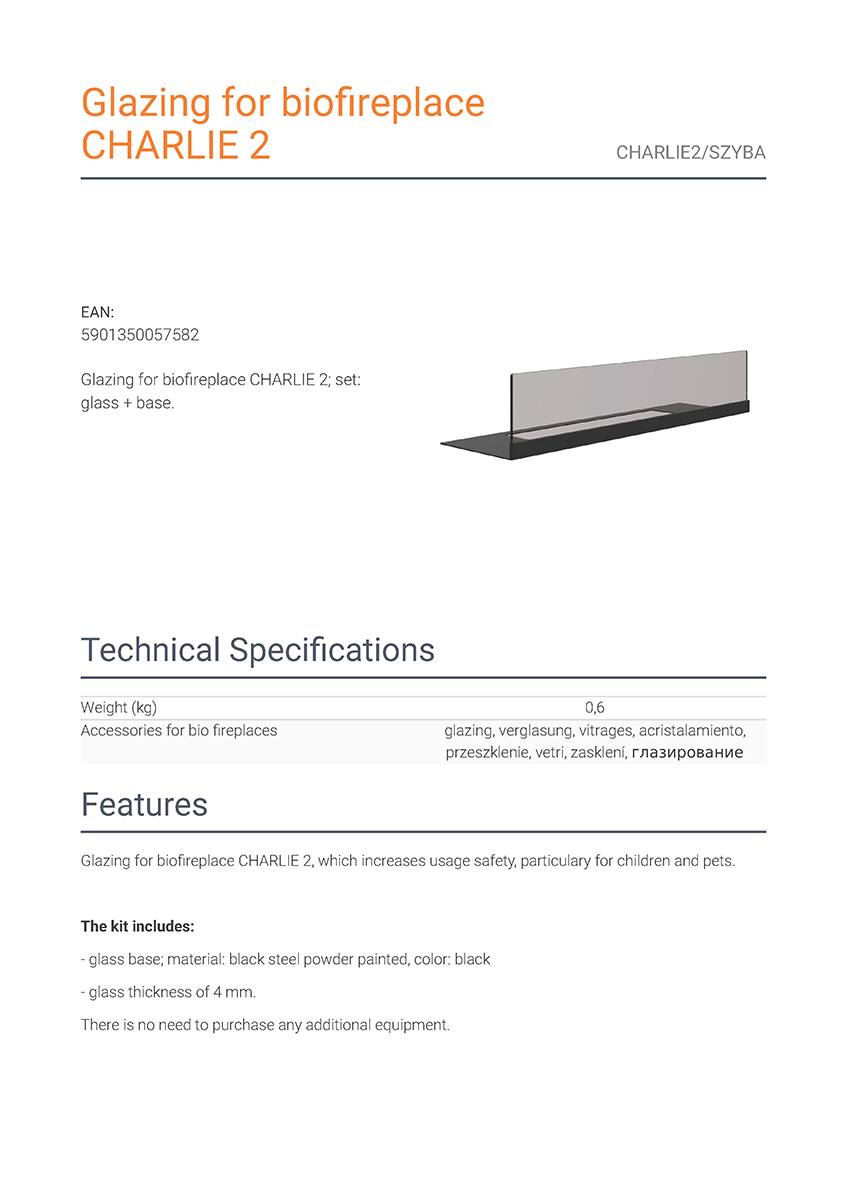 KRATKI CHARLIE2/SZYBA Το CHARLIE2/SZYBA αποτελεί σετ προστατευτικού τζαμιού και βάσης για τις εστίες βιοαιθανόλης τύπου CHARLIE2.