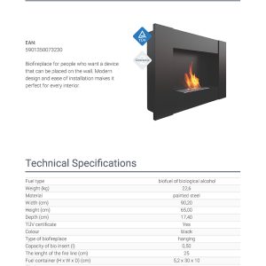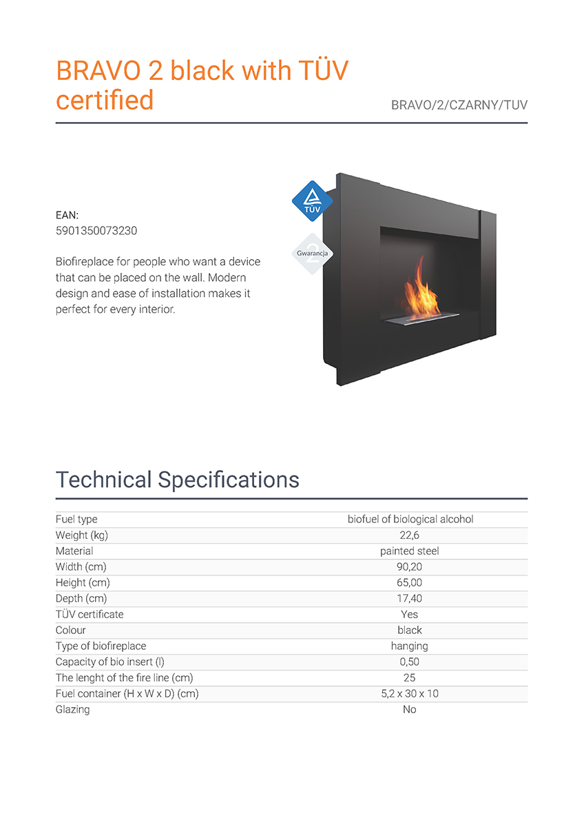 Η Kratki Bravo 2 Black TUV αποτελεί επιτοίχια εστία βιοαιθανόλης κατασκευασμένη από χάλυβα. Διαθέτει ίσια όψη και καυστήρα κατασκευασμένο από inox με χωρητικότητα βιοκαυσίμου 500 mL και πιστοποίηση ασφάλειας TÜV.