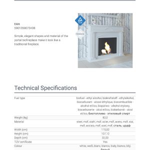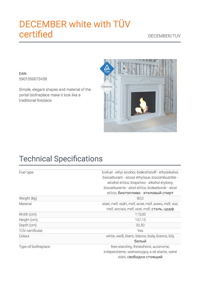 Η Kratki December TUV αποτελεί επιδαπέδια εστία βιοαιθανόλης ίσιας όψης, κατασκευασμένη από χάλυβα με διακοσμητική επένδυση από ξύλο (MDF) και καυστήρα από ανοξείδωτο ατσάλι (Inox). Διαθέτει μήκος φλόγας 35 εκατοστά, καυστήρα με χωρητικότητα βιοκαυσίμου 750 mL και πιστοποίηση ασφάλειας TÜV.