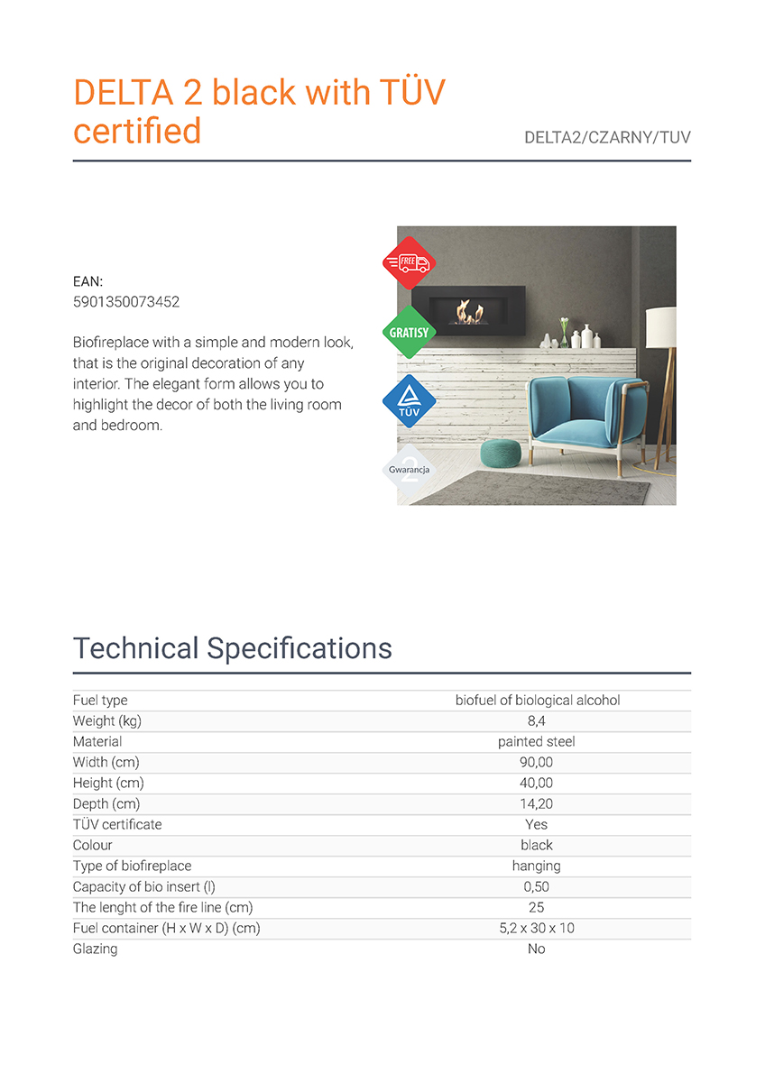 Η Kratki Delta 2 Black TUV αποτελεί επιτοίχια εστία βιοαιθανόλης κατασκευασμένη από χάλυβα. Διαθέτει ίσια όψη, χωρητικότητα βιοκαυσίμου 500 mL και καυστήρα βιοαιθανόλης κατασκευασμένο από inox με πιστοποίηση ασφάλειας TÜV.