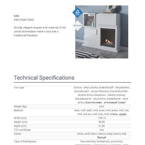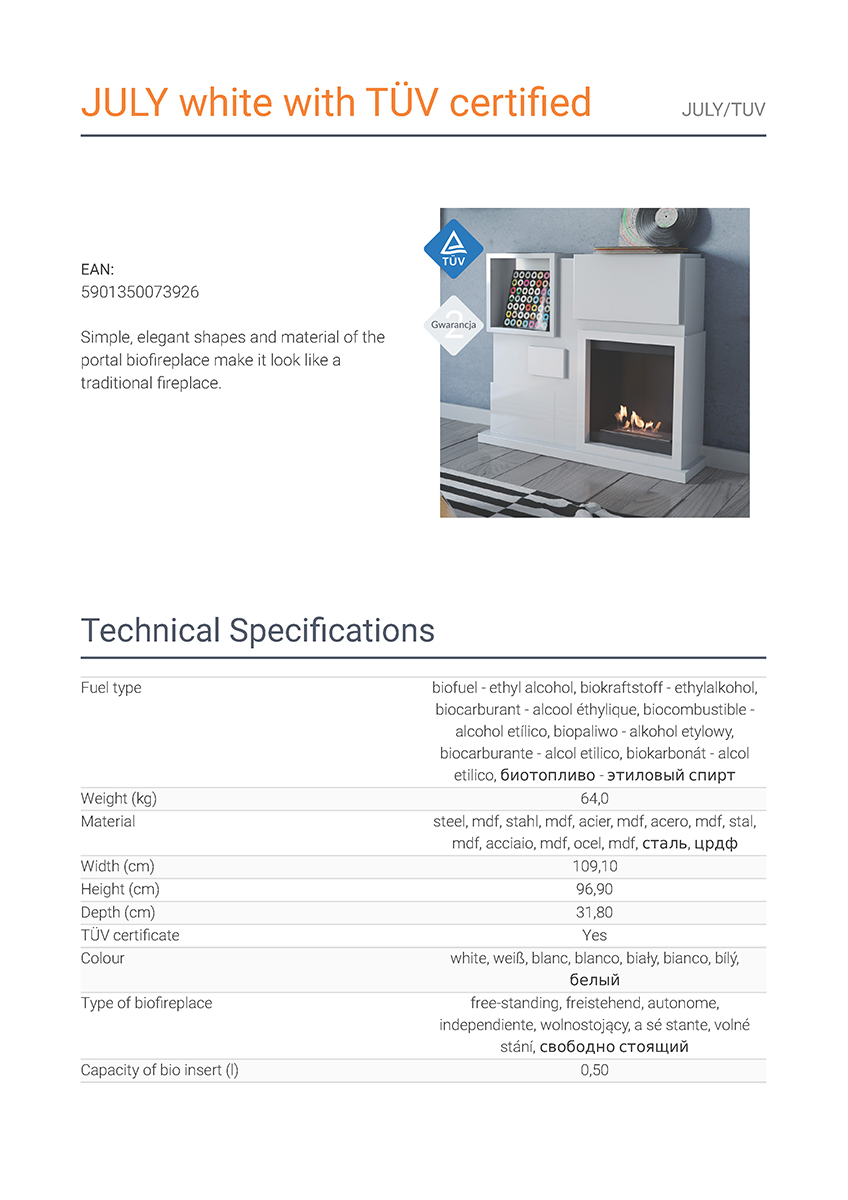 Η Kratki July TUV αποτελεί επιδαπέδια εστία βιοαιθανόλης ίσιας όψης, κατασκευασμένη από χάλυβα με διακοσμητική επένδυση από ξύλο (MDF) και καυστήρα από ανοξείδωτο ατσάλι (Inox). Διαθέτει μήκος φλόγας 25 εκατοστά, καυστήρα με χωρητικότητα βιοκαυσίμου 500 mL και πιστοποίηση ασφάλειας TÜV.