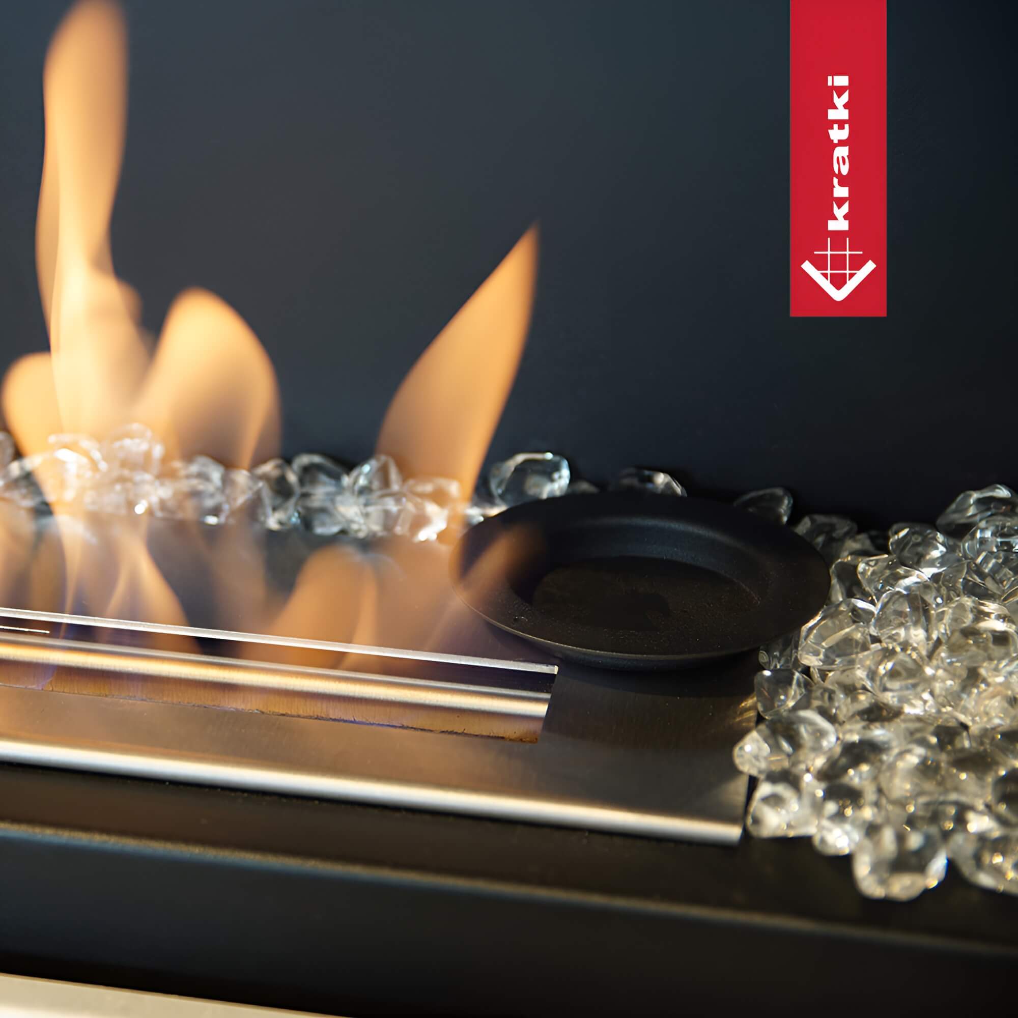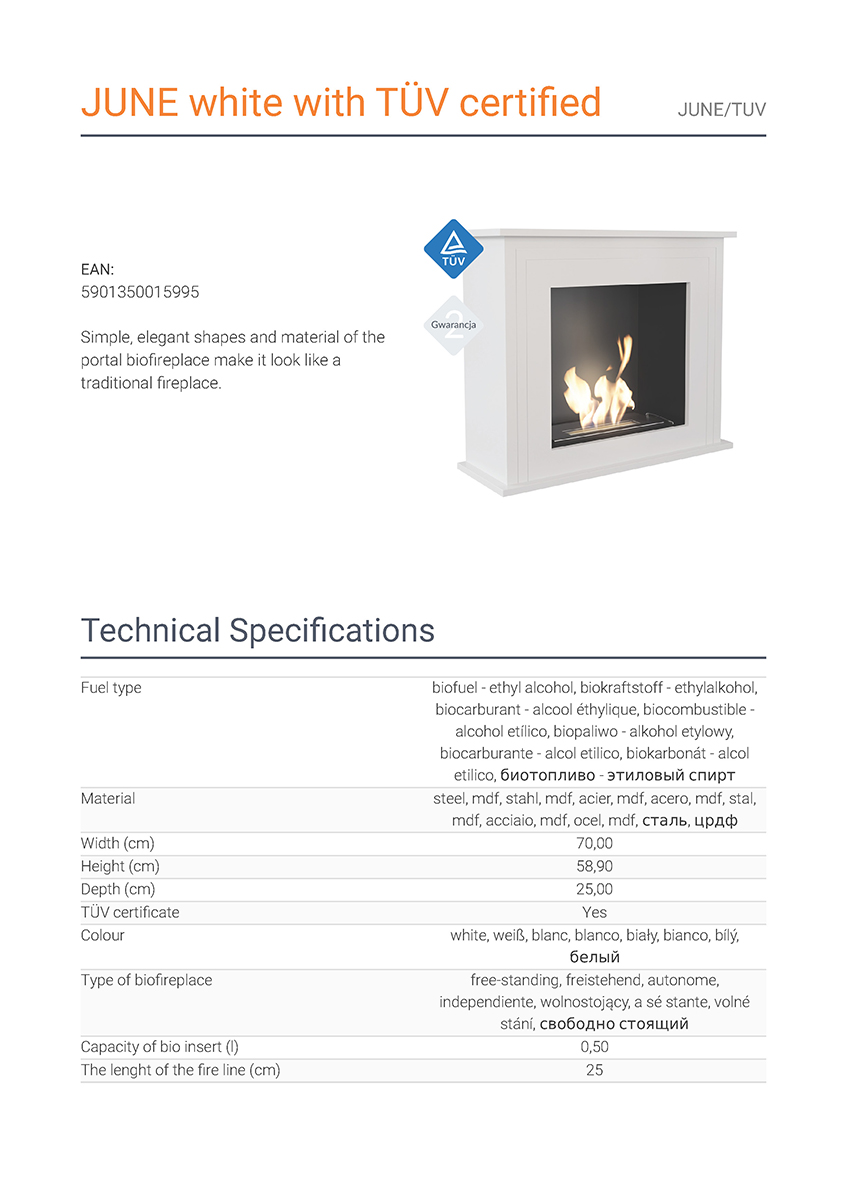 Η Kratki June TUV αποτελεί επιδαπέδια εστία βιοαιθανόλης ίσιας όψης, κατασκευασμένη από χάλυβα με διακοσμητική επένδυση από ξύλο (MDF) και καυστήρα από ανοξείδωτο ατσάλι (Inox). Διαθέτει μήκος φλόγας 25 εκατοστά, καυστήρα με χωρητικότητα βιοκαυσίμου 500 mL και πιστοποίηση ασφάλειας TÜV.