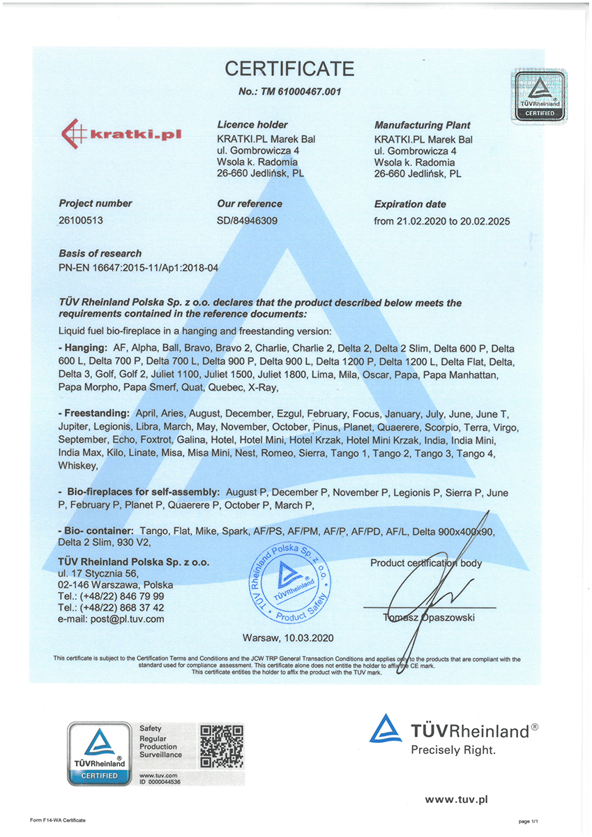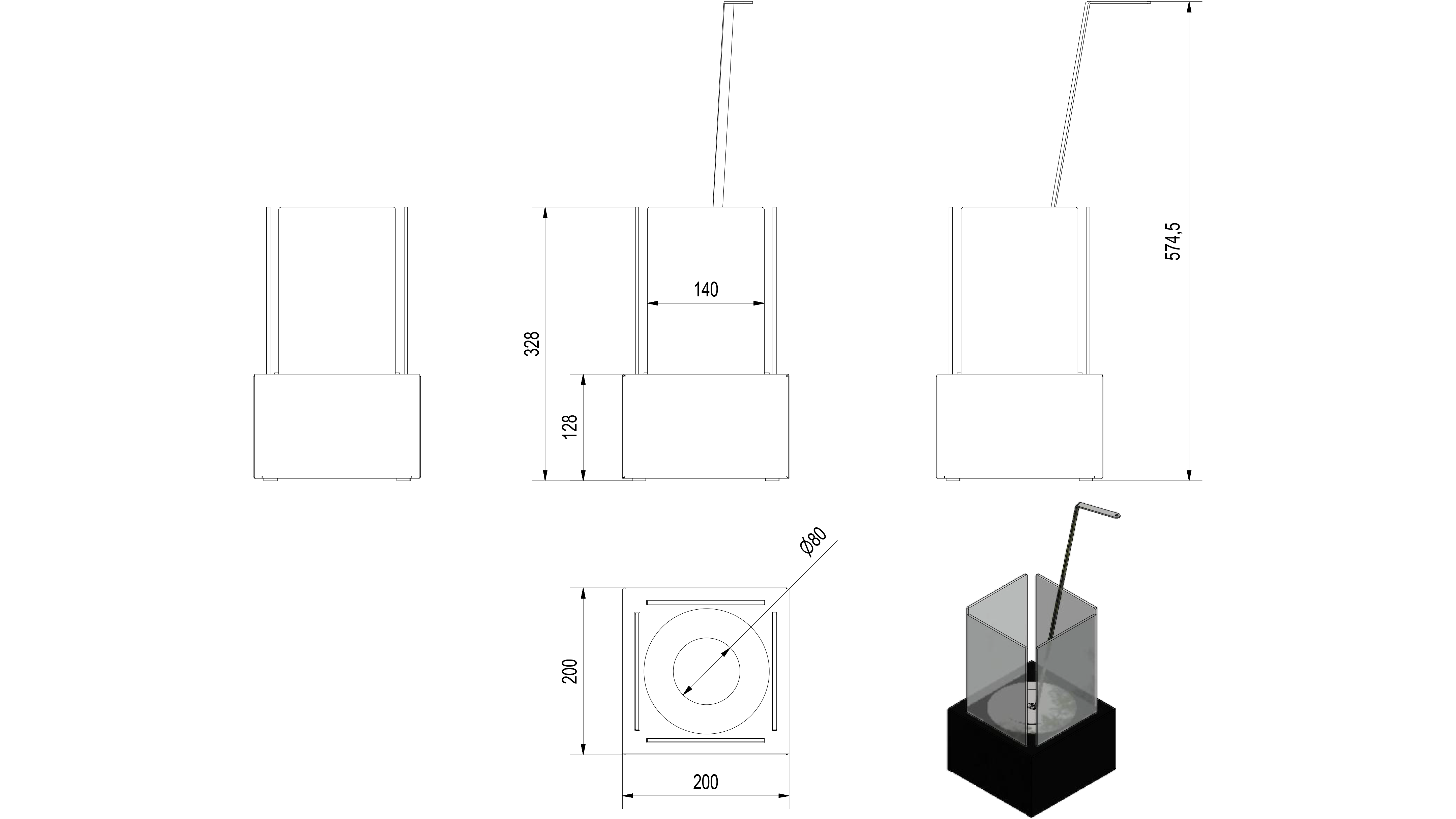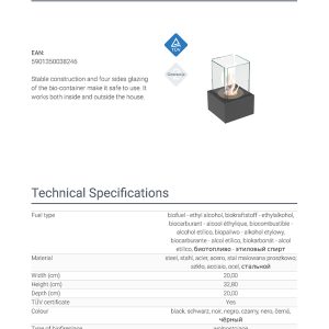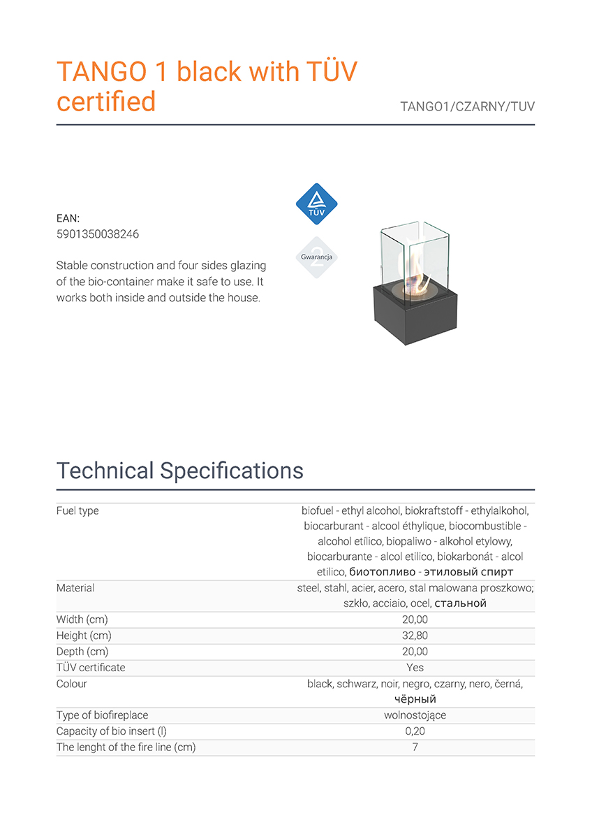 Η Kratki Tango 1 Czarny Tuv αποτελεί επιτραπέζια εστία βιοαιθανόλης, κατασκευασμένη από χάλυβα με καυστήρα από ανοξείδωτο ατσάλι (INOX). Η σταθερή κατασκευή και το προστατευτικό κρύσταλλο στις τέσσερις πλευρές της την καθιστούν ασφαλέστατη στη χρήση. Είναι κατάλληλη τόσο για εσωτερικούς όσο και για εξωτερικούς χώρους.