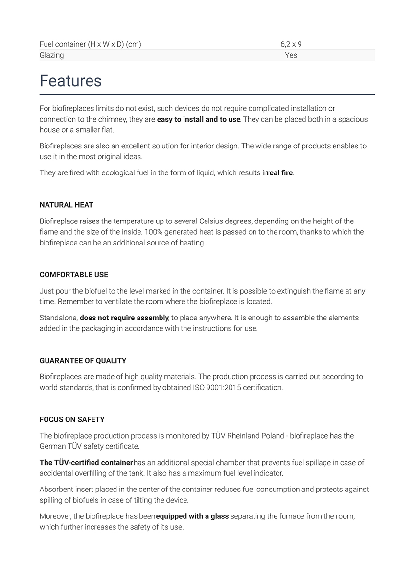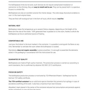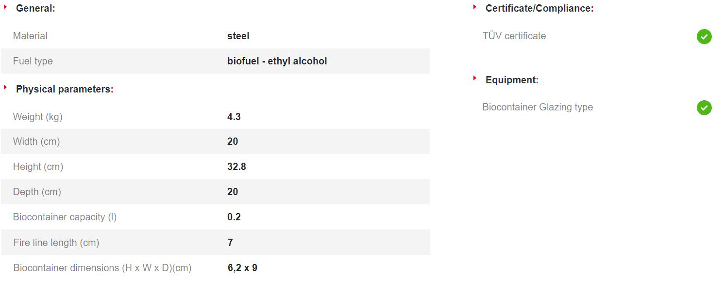 Διαθέτει καυστήρα βιοαιθανόλης με χωρητικότητα βιοκαυσίμου 200 mL, μήκος φλόγας 7 cm και πιστοποίηση ασφάλειας TÜV.