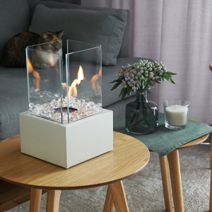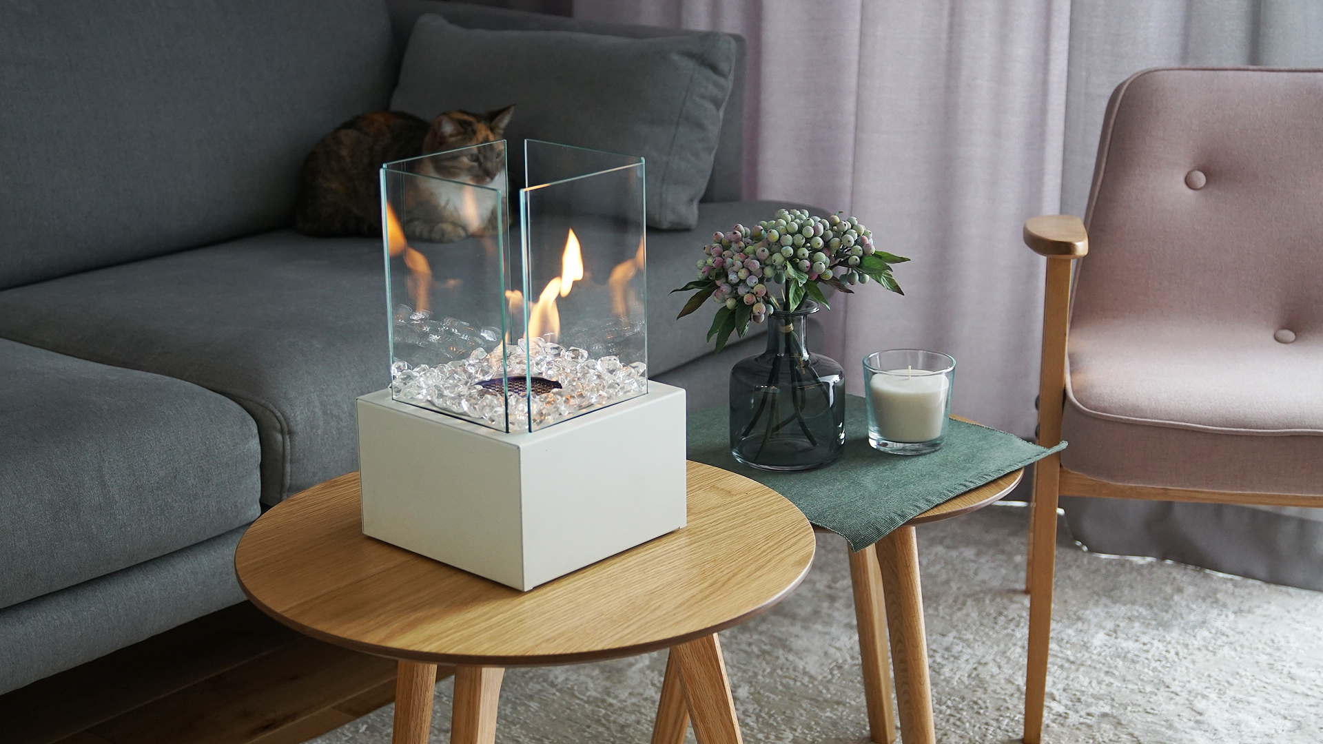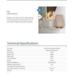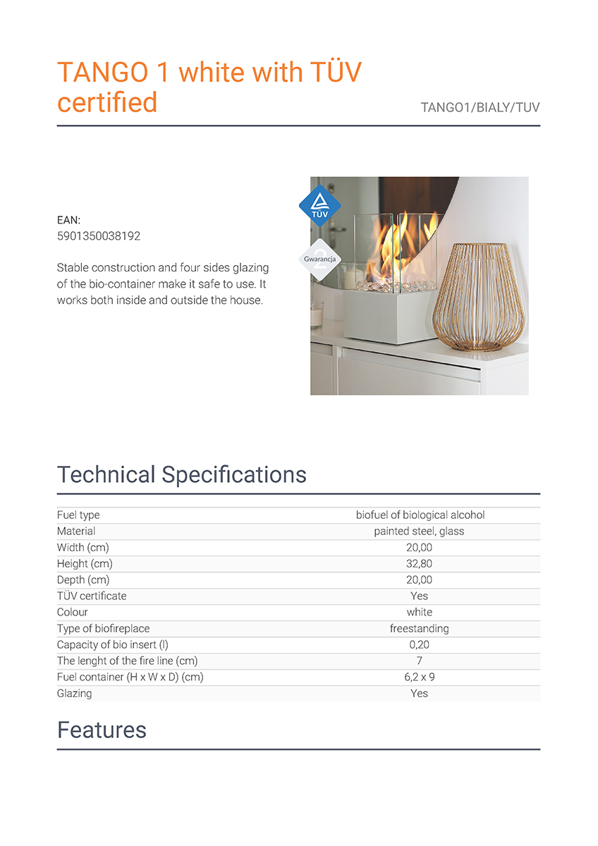 Η Kratki Tango 1 Bialy Tuv αποτελεί επιτραπέζια εστία βιοαιθανόλης, κατασκευασμένη από χάλυβα με καυστήρα από ανοξείδωτο ατσάλι (INOX). Η σταθερή κατασκευή και το προστατευτικό κρύσταλλο στις τέσσερις πλευρές της την καθιστούν ασφαλέστατη στη χρήση. Είναι κατάλληλη τόσο για εσωτερικούς όσο και για εξωτερικούς χώρους.