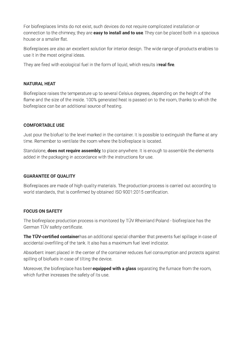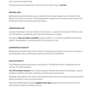 Διαθέτει καυστήρα βιοαιθανόλης με χωρητικότητα βιοκαυσίμου 200 mL, μήκος φλόγας 7 cm και πιστοποίηση ασφάλειας TÜV.
