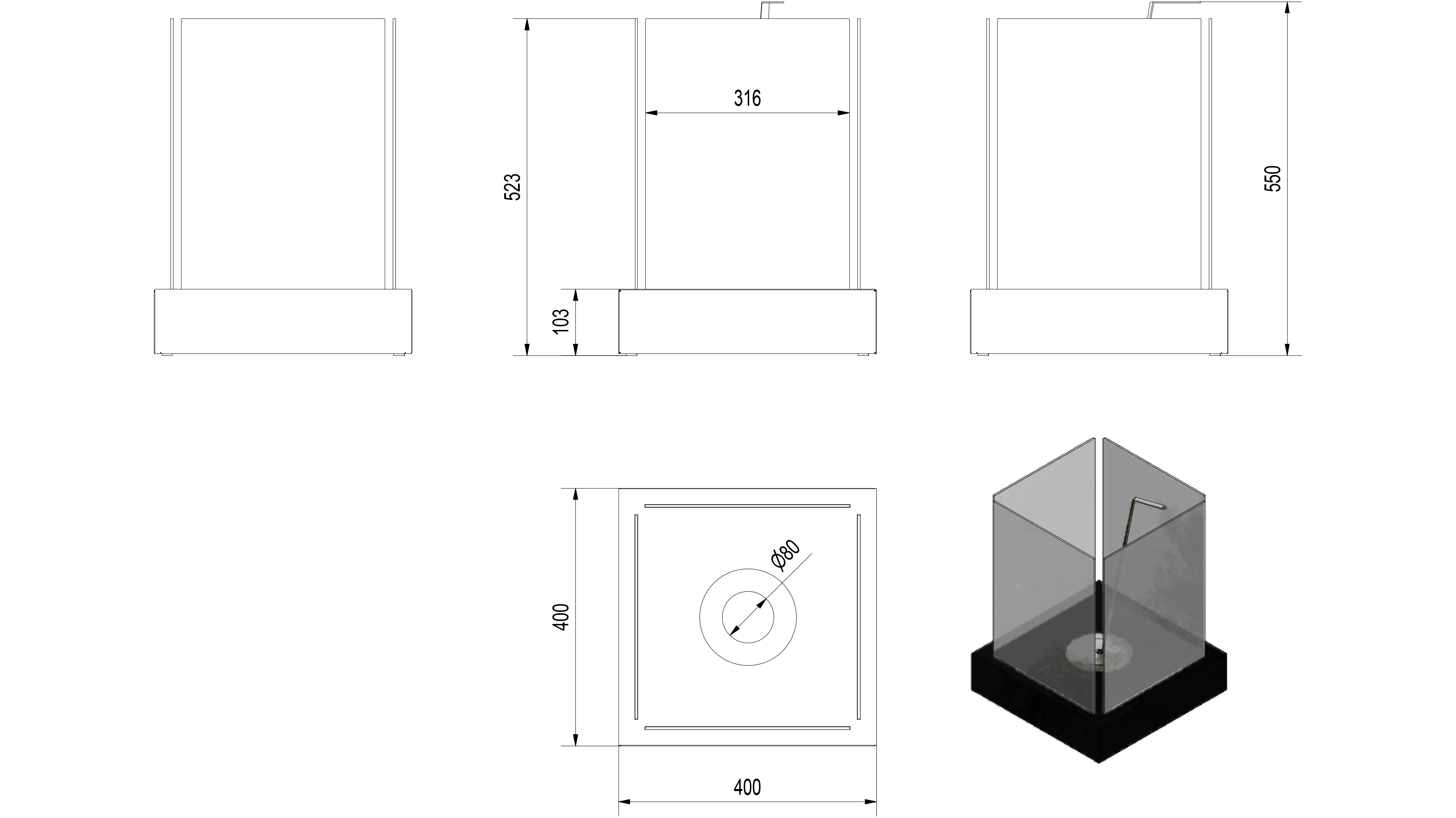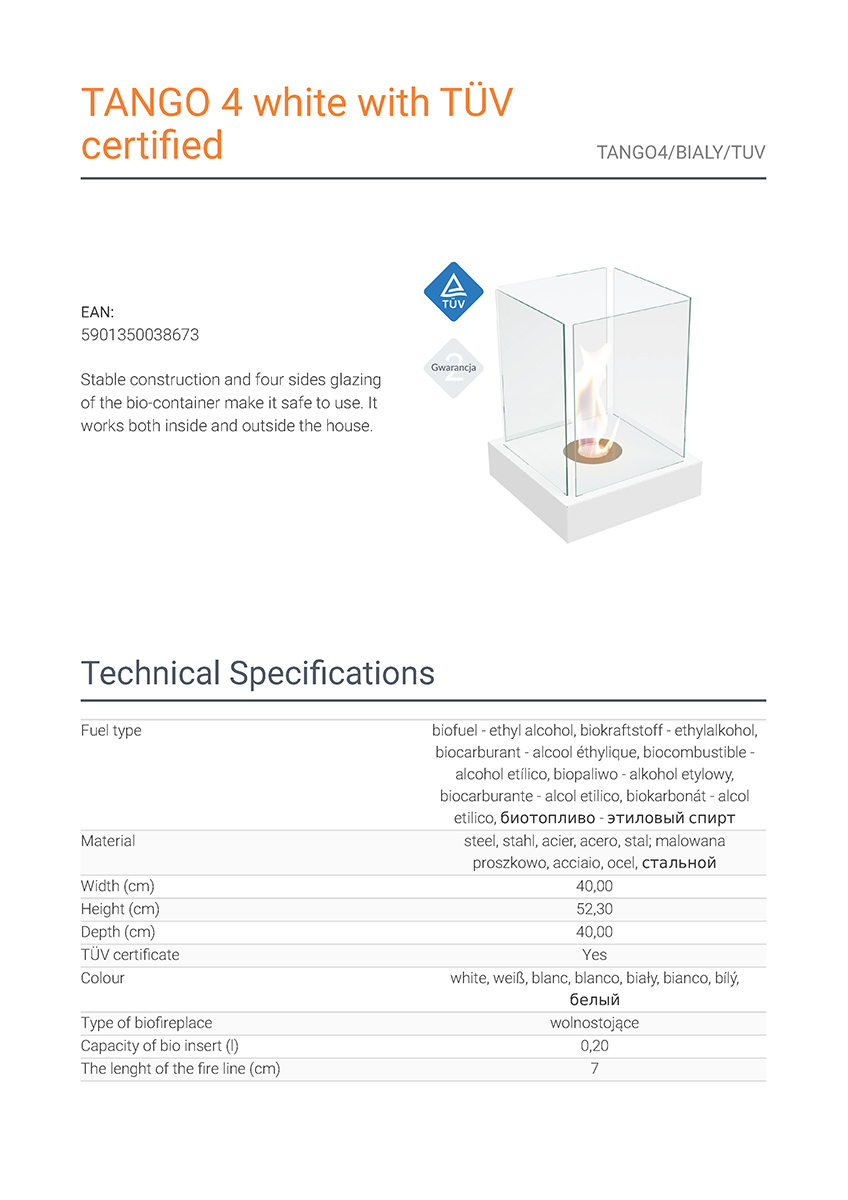 Η Kratki Tango 4 Bialy Tuv αποτελεί επιτραπέζια εστία βιοαιθανόλης, κατασκευασμένη από χάλυβα με καυστήρα από ανοξείδωτο ατσάλι (INOX). Η σταθερή κατασκευή και το προστατευτικό κρύσταλλο στις τέσσερις πλευρές της την καθιστούν ασφαλέστατη στη χρήση. Είναι κατάλληλη τόσο για εσωτερικούς όσο και για εξωτερικούς χώρους.